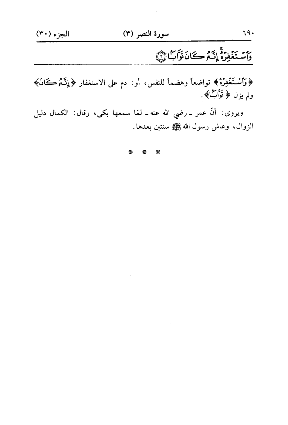 {واستغفره} تواضعاً وهضماً للنفس أو دم على الاستغفار {إِنَّهُ كَانَ} ولم يزل {توابا} التواب الكثير القبول التوبة وفي صفة العباد الكثير الفعل للتوبة ويروى أن عمر رضي الله عنه لما سمعها بكى وقال الكمال دليل الزوال وعاش رسول الله صلى الله عليه وسلم بعدها سنتين والله أعلم