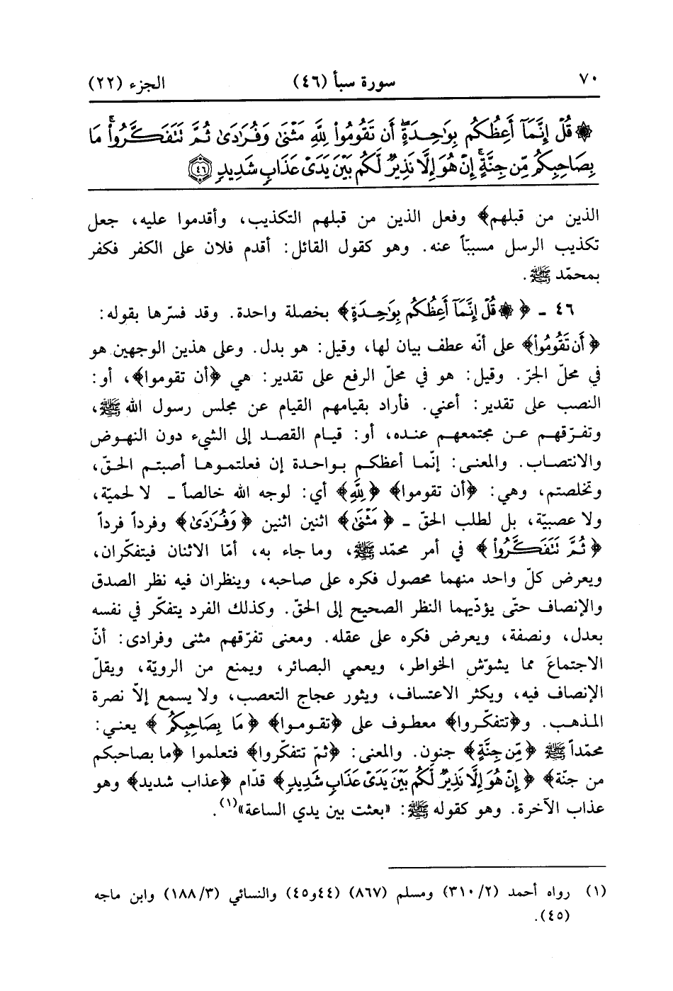 قُلْ إِنَّمَا أَعِظُكُمْ بِوَاحِدَةٍ أَنْ تَقُومُوا لِلَّهِ مَثْنَى وَفُرَادَى ثُمَّ تَتَفَكَّرُوا مَا بِصَاحِبِكُمْ مِنْ جِنَّةٍ إِنْ هُوَ إِلَّا نَذِيرٌ لَكُمْ بَيْنَ يَدَيْ عَذَابٍ شَدِيدٍ (46)