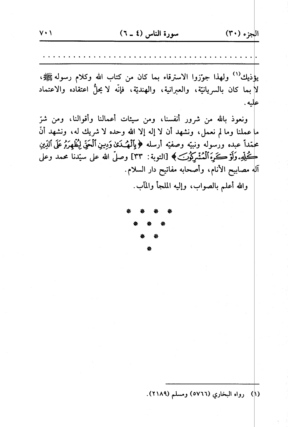 يؤذيك ولهذا جوز الاسترقاء بما كان من كتاب الله وكلام رسول عليه السلام لا بما كان بالسريانية والعبرانية والهندية فإنه لا يحل اعتقاده والاعتماد عليه ونعوذ بالله من شرور أنفسنا ومن سيآت أعمالنا وأقوالنا ومن شر ما عملنا وما لم نعمل ونشهد أن لا إله إلا الله وحده لا شريك له وأن محمداً عبده ورسوله ونبيه وصفيه أرسله بالهدى ودين الحق ليظهره على الدين كله ولو كره المشركون صلى الله عليه وعلى آله مصابيح الأنام وأصحابه مفاتيح دار السلام صلاة دائمة ما دامت الليالى والأيام