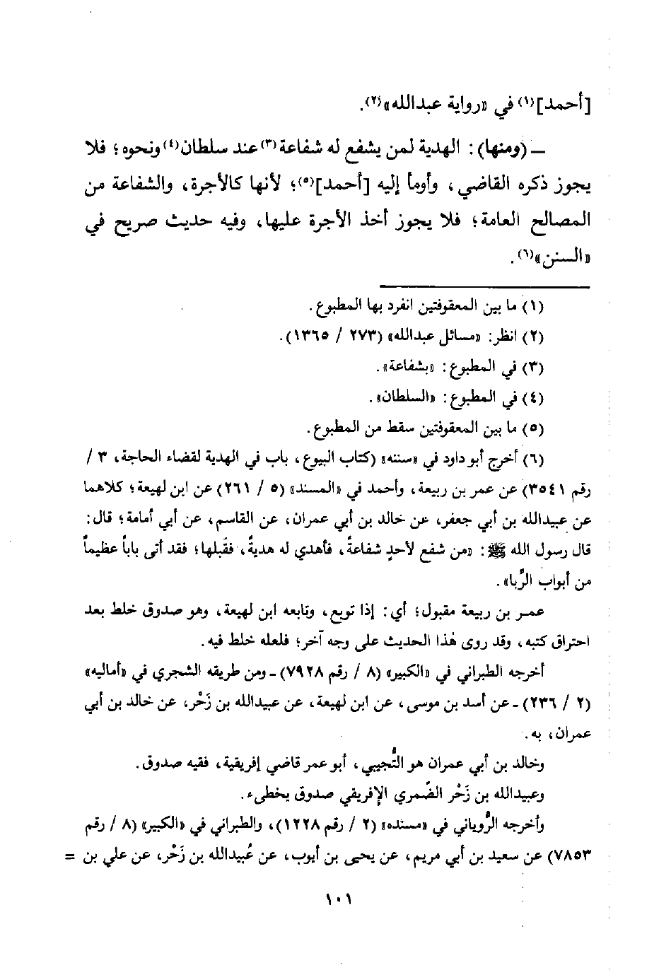 (¬6) أخرج أبو داود في "سننه" (كتاب البيوع، باب في الهدية لقضاء الحاجة، 3/ رقم 3541) عن عمر بن ربيعة، وأحمد في "المسند" (5/ 261) عن ابن لهيعة؛ كلاهما عن عبيد اللَّه بن أبي جعفر، بن خالد بن أبي عمران، عن القاسم، عن أبي أمامة؛ قال: قال رسول اللَّه -صلى اللَّه عليه وسلم-: "من شفع لأحدٍ شفاعةً، فأهدي له هديةً، فقَبلها؛ فقد أتى بابًا عظيمًا من أبواب الرِّبا".