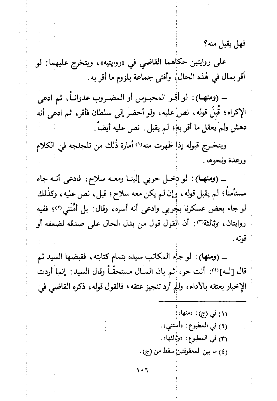 - (ومنها): لو أقر المحبوس أو المضروب عدوانًا، ثم ادعى الإكراه؛ قُبِلَ قوله، نص عليه، ولو أحضر إلى سلطان فأقر، ثم ادعى أنه دهش ولم يعقل ما أقر به؛ لم يقبل. نص عليه أيضًا.