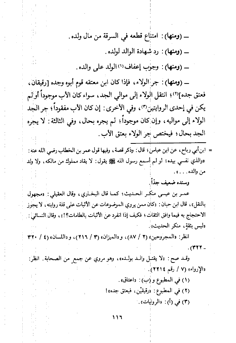 - (ومنها): جر الولاء، فإذا كان ابن معتقه قوم أبوه وجده [رقيقان، فعتق جده] (¬2)؛ انتقل الولاء إلى موالي الجد، سواء كان الأب موجودًا أو لم يكن في إحدى الروايتين (¬3)، وفي الأخرى: إن كان الأب مفقودًا؛ جر الجد الولاء إلى مواليه، وإن كان موجودًا؛ لم يجره بحال، وفي الثالثة: لا يجره الجد بحال؛ فيختص جر الولاء بعتق الأب.