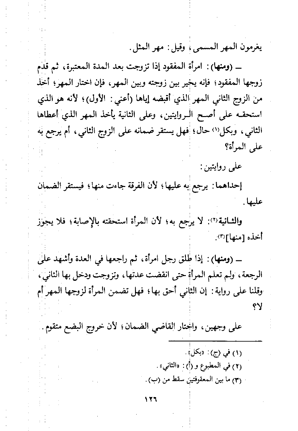 - (ومنها): امرأة المفقود إذا تزوجت بعد المدة المعتبرة، ثم قدم زوجها المفقود؛ فإنه يخير بين زوجته وبين المهر، فإن اختار المهر؛ أخذ من الزوج الثاني المهر الذي أقبضه إياها (أعني: الأول)؛ لأنه هو الذي استحقه على أصح الروايتين، وعلى الثانية يأخذ المهر الذي أعطاها الثاني، وبكل (¬1) حال؛ فهل يستقر ضمانه على الزوج الثاني، أم يرجع به على المرأة؟