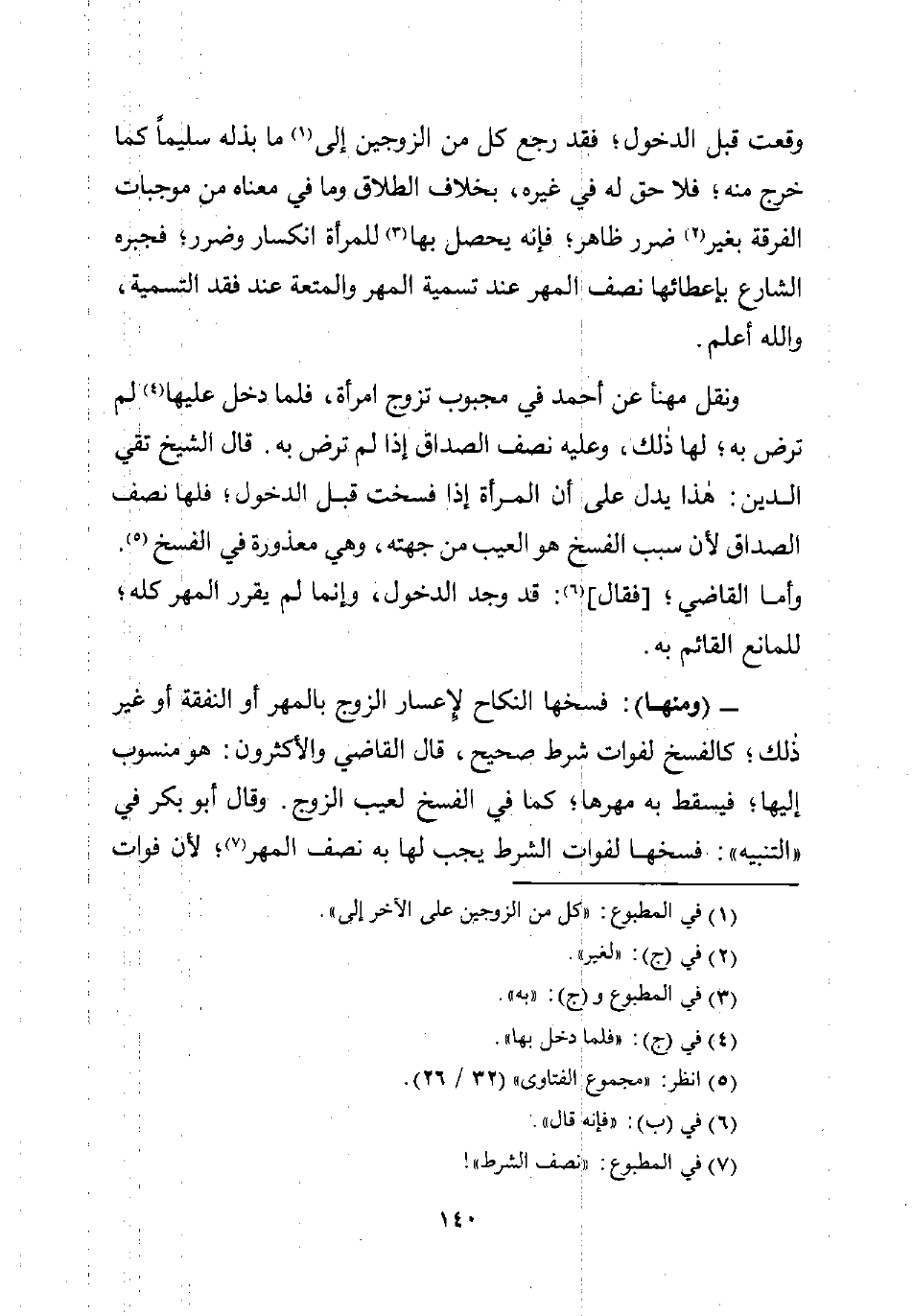 - (ومنها): فسخها النكاح لإعسار الزوج بالمهر أو النفقة أو غير ذلك؛ كالفسخ لفوات شرط صحيح، قال القاضي والأكثرون: هو منسوب إليها؛ فيسقط به مهرها؛ كما في الفسخ لعيب الزوج. وقال أبو بكر في "التنبيه": فسخها لفوات الشرط يجب لها به نصف المهر (¬7)؛ لأن فوات
