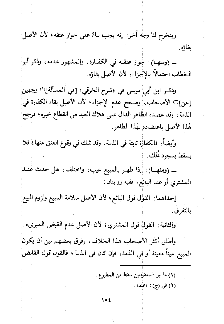 - (ومنها): جواز عتقه في الكفارة، والمشهور عدمه، وذكر أبو الخطاب احتمالًا بالإجزاء؛ لأن الأصل بقاؤه.