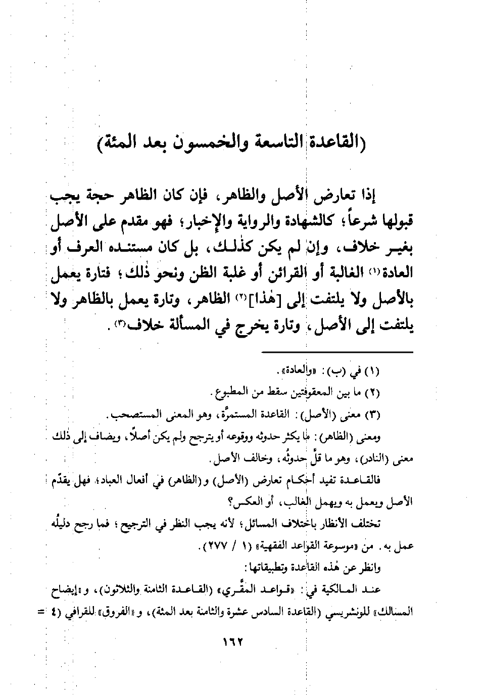 إذا تعارض الأصل والظاهر، فإن كان الظاهر حجة يجب قبولها شرعًا؛ كالشهادة والرواية والإخبار؛ فهو مقدم على الأصل بغير خلاف، وإن لم يكن كدلك، بل كان مستنده العرف أو العادة (¬1) الغالبة أو القرائن أو غلبة الظن ونحو ذلك؛ فتارة يعمل بالأصل ولا يلتفت إلى [هذا] (¬2) الظاهر، وتارة يعمل بالظاهر ولا يلتفت إلى الأصل، وتارة يخرج في المسألة خلاف (¬3).