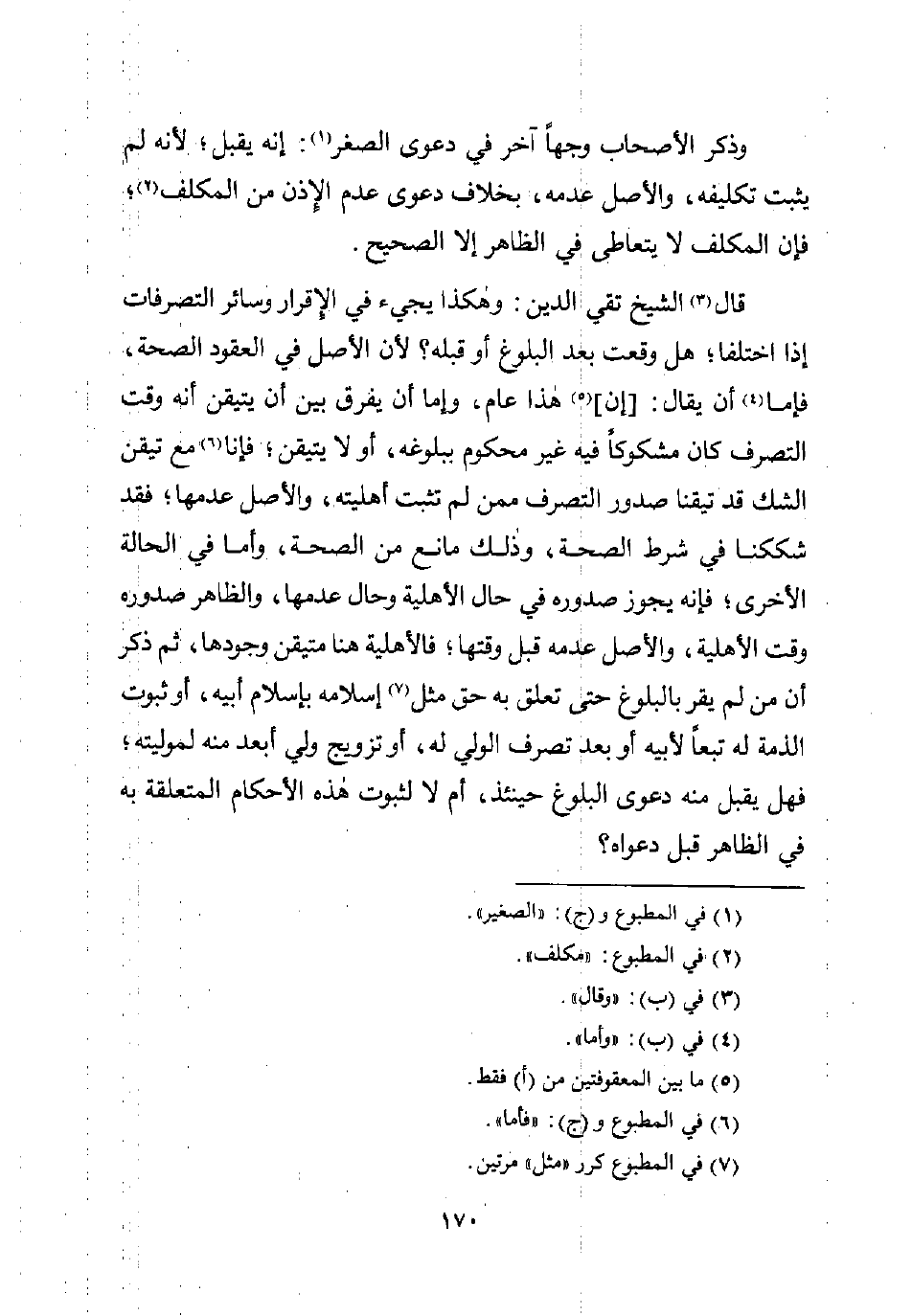 قال (¬3) الشيخ تقي الدين: وهكذا يجيء في الإقرار وسائر التصرفات إذا اختلفا؛ هل وقعت بعد البلوغ أو قبله؛ لأن الأصل في العقود الصحة، فإما (¬4) أن يقال: [إن] (¬5) هذا عام، وإما أن يفرق بين أن يتيقن أنه وقت التصرف كان مشكوكًا فيه غير محكوم ببلوغه، أو لا يتيقن؛ فإنا (¬6) مع تيقن الشك قد تيقنا صدور التصرف ممن لم تثبت أهليته، والأصل عدمها؛ فقد شككنا في شرط الصحة، وذلك مانع من الصحة، وأما في الحالة الأخرى؛ فإنه يجوز صدوره في حال الأهلية وحال عدمها، والظاهر صدوره وقت الأهلية، والأصل عدمه قبل وقتها؛ فالأهلية هنا متيقن وجودها، ثم ذكر أن من لم يقر بالبلوغ حتى تعلق به حق مثل (¬7) إسلامه بإسلام أبيه، أو ثبوت الذمة له تبعًا لأبيه أو بعد تصرف الولي له، أو تزويج ولي أبعد منه لموليته؛ فهل يقبل منه دعوى البلوغ حينئذ، أم لا لثبوت هذه الأحكام المتعلقة به في الظاهر قبل دعواه؟