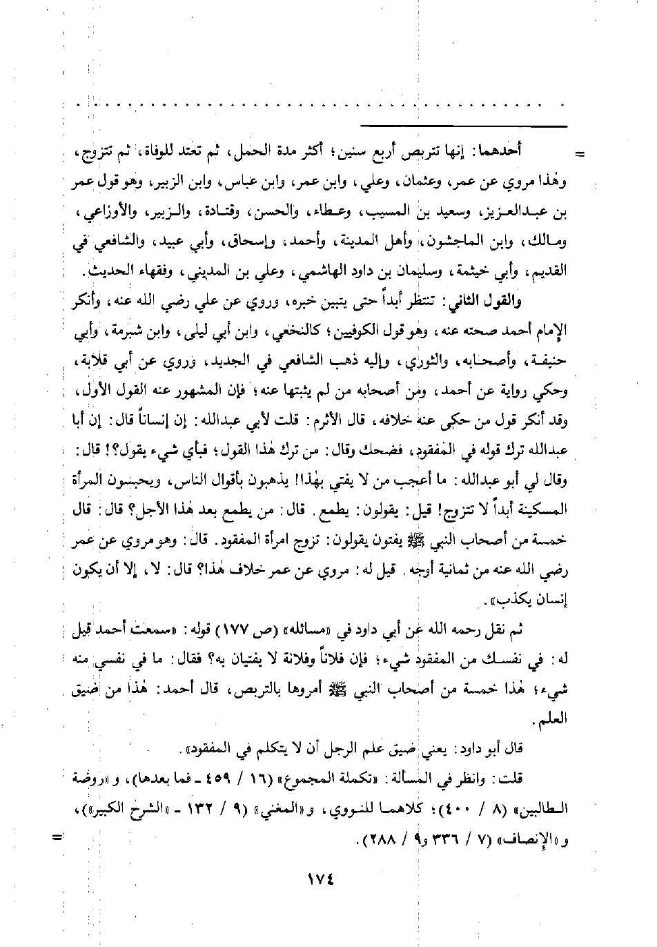 ثم نقل رحمه اللَّه عن أبي داود في "مسائله" (ص 177) قوله: "سمعت أحمد قيل له: في نفسك من المفقود شيء؛ فإن فلانًا وفلانة لا يفتيان به؟ فقال ما في نفسي منه شيء؛ هذا خمسة من أصحاب النبي -صلى اللَّه عليه وسلم- أمروها بالتربص، قال أحمد: هذا من ضيق العلم.