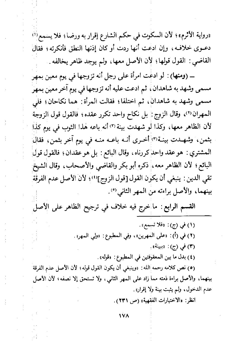 (¬5) نص كلامه رحمه اللَّه: "وينبغي أن يكون القول قوله؛ لأن الأصل عدم الفرقة بينهما، والأصل براءة ذمته مما زاد على المهر الثاني، ولا تستحق إلا نصفه؛ لأن الأصل عدم الدخول، ولم يثبت بينة ولا إقرار".