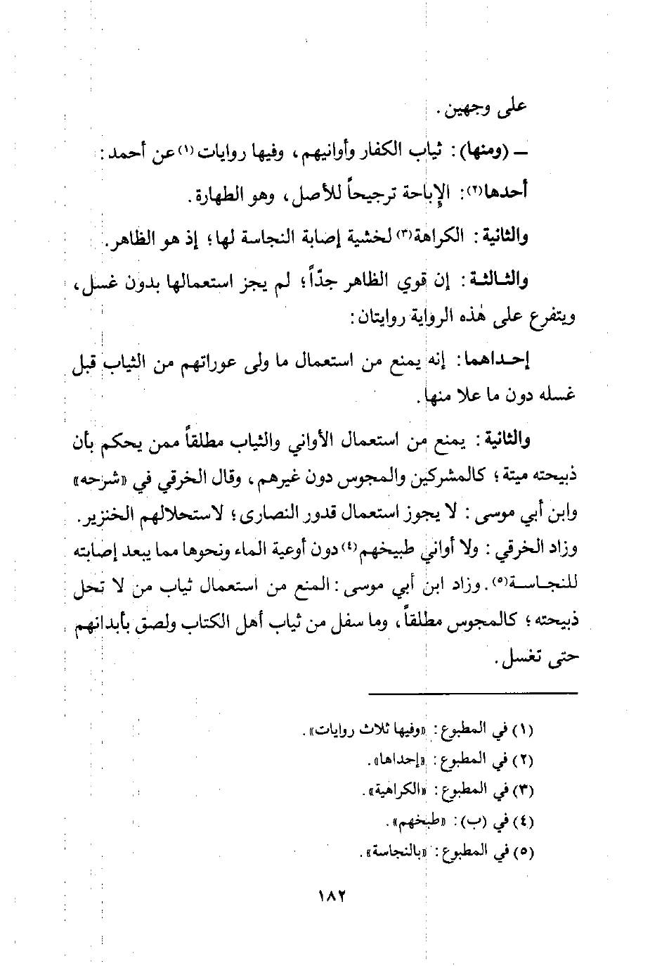 والثانية: يمنع من استعمال الأواني والثياب مطلقًا ممن يحكم بأن ذبيحته ميتة؛ كالمشركين والمجوس دون غيرهم، وقال الخرقي في "شرحه" وابن أبي موسى: لا يجوز استعمال قدور النصارى؛ لاستحلالهم الخنزير. وزاد الخرقي: ولا أواني طبيخهم (¬4) دون أوعية الماء ونحوها مما يبعد إصابته للنجاسة (¬5). وزاد ابن أبي موسى: المنع من استعمال ثياب من لا تحل ذبيحته؛ كالمجوس مطلقًا، وما سفل من ثياب أهل الكتاب ولصق بأبدانهم حتى تغسل.