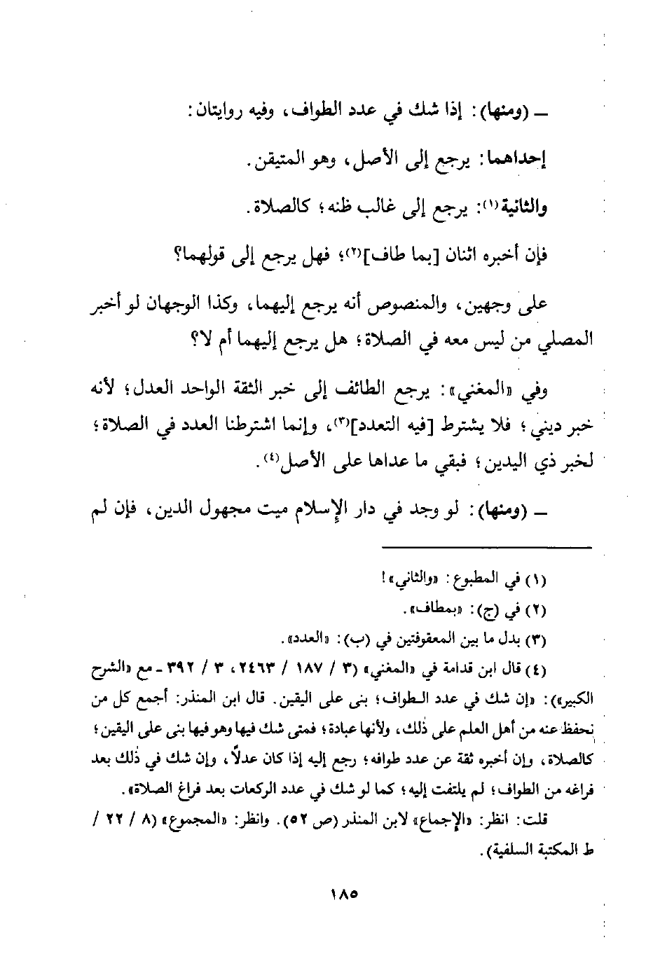 (¬4) قال ابن قدامة في "المغني" (3/ 187/ 2463، 3/ 392 - مع "الشرح الكبير"): "إن شك في عدد الطواف؛ بني على اليقين. قال ابن المنذر: أجمع كل من نحفظ عنه من أهل العلم على ذلك، ولأنها عبادة؛ فمتى شك فيها وهو فيها بنى على اليقين؛ كالصلاة، وإن أخبره ثقة عن عدد طوافه؛ رجع إليه إذا كان عدلًا، وإن شك في ذلك بعد فراغه من الطواف؛ لم يلتفت إليه؛ كما لو شك في عدد الركعات بعد فراغ الصلاة".
