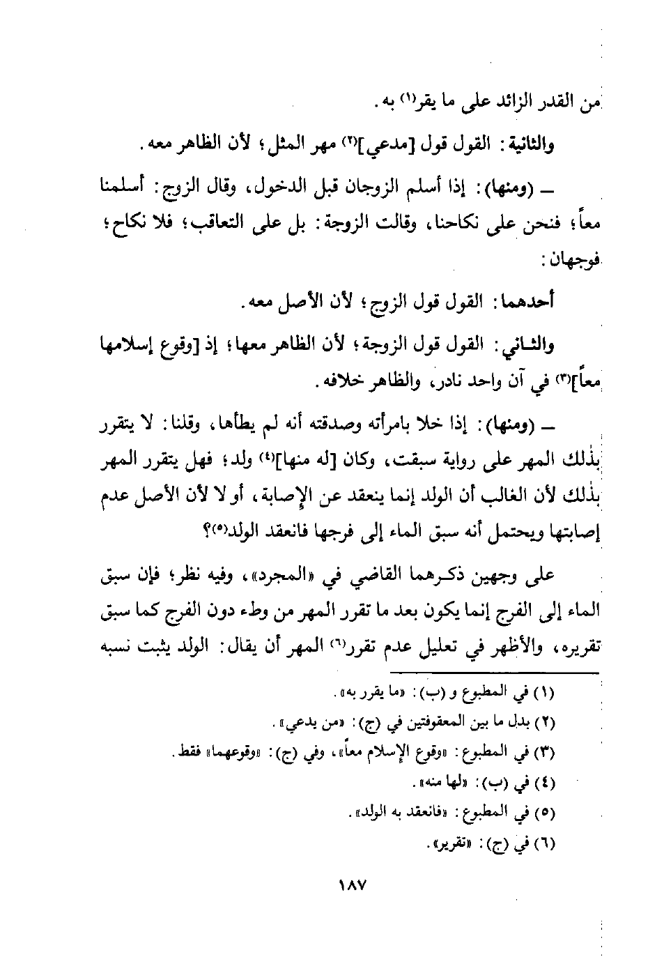 - (ومنها): إذا أسلم الزوجان قبل الدخول، وقال الزوج: أسلمنا معًا؛ فنحن على نكاحنا، وقالت الزوجة: بل على التعاقب؛ فلا نكاح؛ فوجهان: