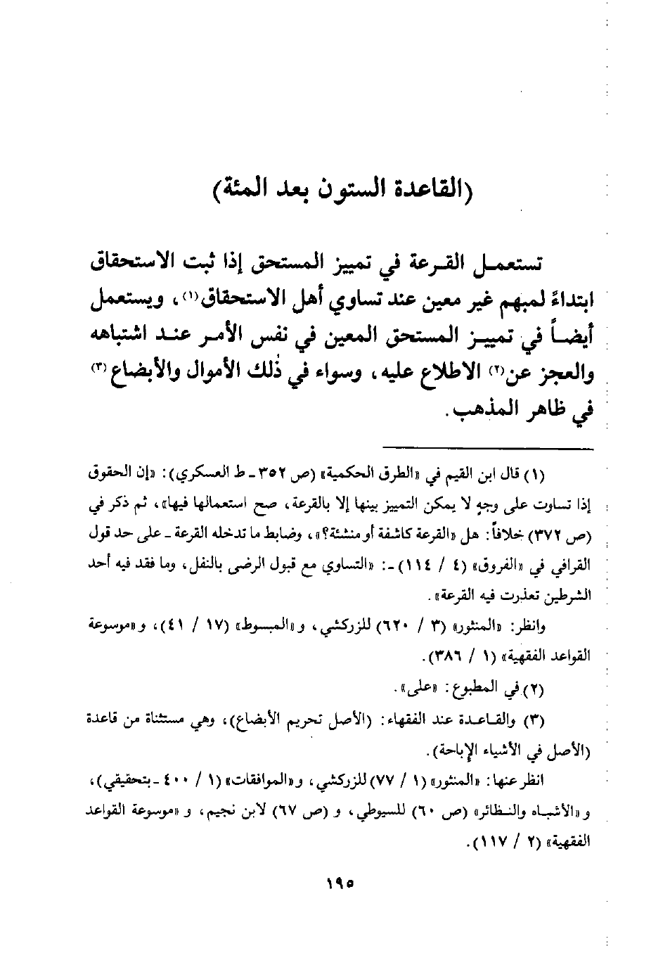 (¬1) قال ابن القيم في "الطرق الحكمية" (ص 352 - ط العسكري): "إن الحقوق إذا تساوت على وجهٍ لا يمكن التمييز بينها إلا بالقرعة، صح استعمالها فيها"، ثم ذكر في (ص 372) خلافًا: هل "القرعة كاشفة أو منشئة؟ "، وضابط ما تدخله القرعة -على حد قول القرافي في "الفروق" (4/ 114) -: "التساوي مع قبول الرضى بالنفل، وما فقد فيه أحد الشرطين تعذرت فيه القرعة".