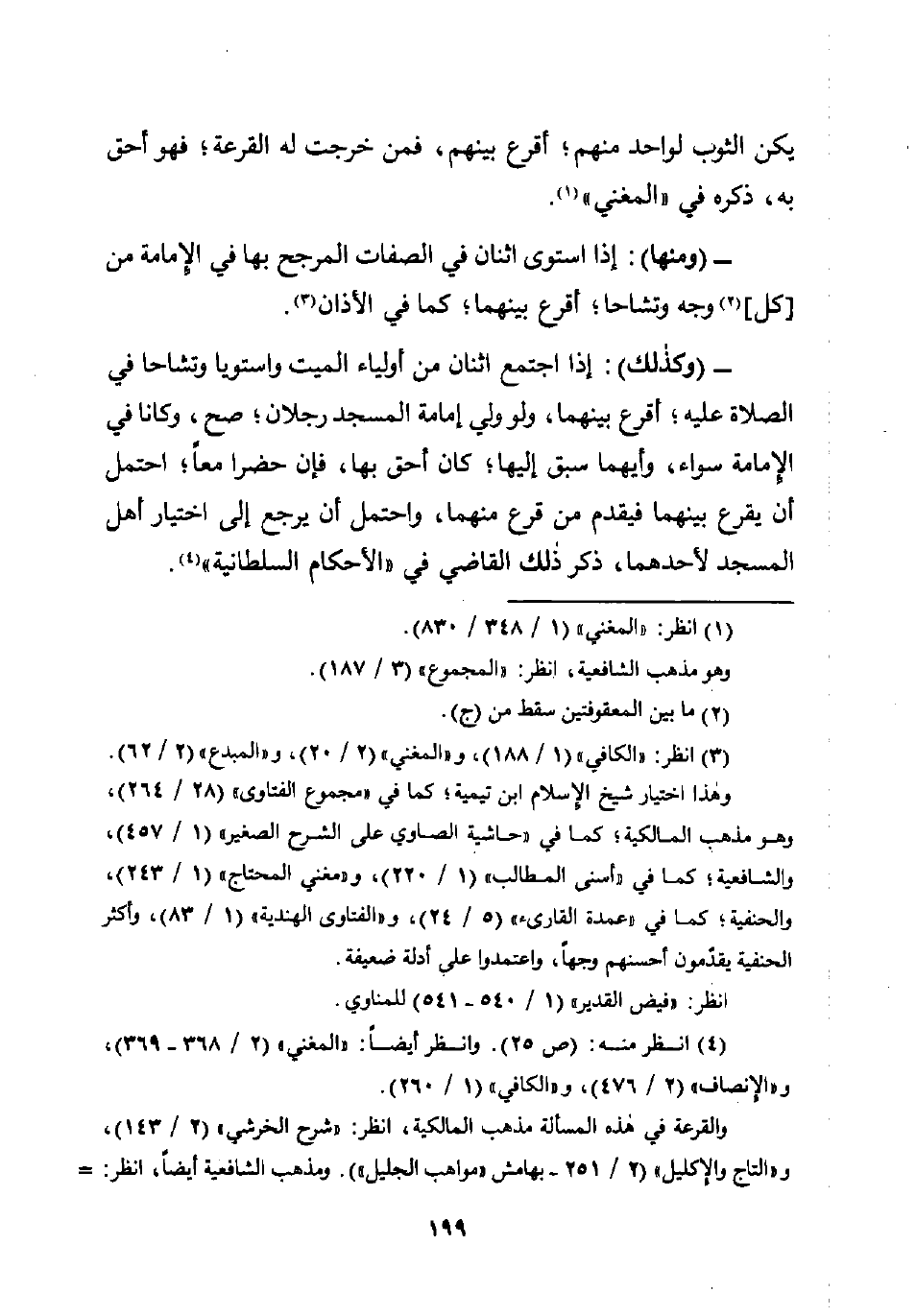 - (وكذلك): إذا اجتمع اثنان من أولياء الميت واستويا وتشاحا في الصلاة عليه؛ أقرع بينهما، ولو ولي إمامة المسجد رجلان؛ صح، وكانا في الإمامة سواء، وأيهما سبق إليها؛ كان أحق بها، فإن حضرا معًا؛ احتمل أن يقرع بينهما فيقدم من قرع منهما، واحتمل أن يرجع إلى اختيار أهل المسجد لأحدهما، ذكر ذلك القاضي في "الأحكام السلطانية" (¬4).