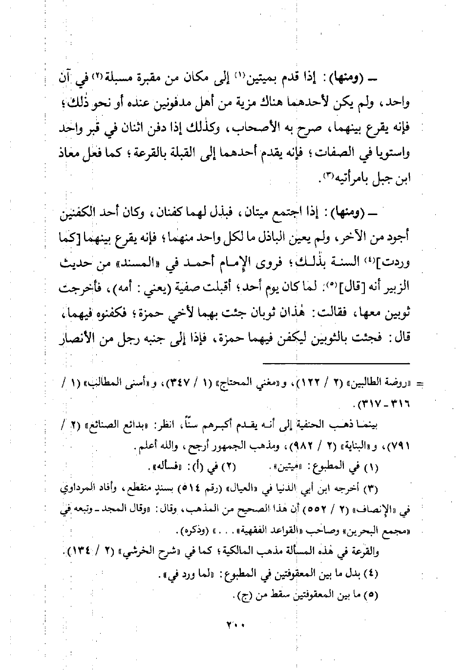 - (ومنها): إذا اجتمع ميتان، فبذل لهما كفنان، وكان أحد الكفنين أجود من الآخر، ولم يعين الباذل مالكل واحد منهما؛ فإنه يقرع بينهما [كما وردت] (¬4) السنة بذلك؛ فروى الإِمام أحمد في "المسند" من حديث الزبير أنه [قال] (¬5). لما كان يوم أحد؛ أقبلت صفية (يعني: أمه)، فأخرجت ثوبين معها، فقالت: هذان ثوبان جئت بهما لأخي حمزة؛ فكفنوه فيهما، قال: فجئت بالثوبين ليكفن فيهما حمزة، فإذا إلى جنبه رجل من الأنصار
