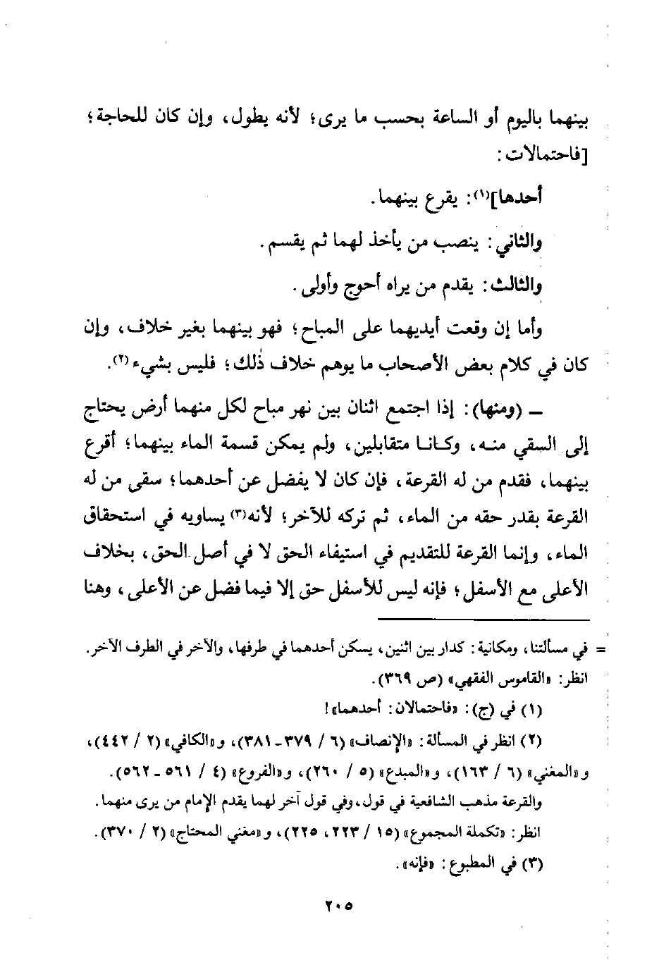 - (ومنها): إذا اجتمع اثنان بين نهر مباح لكل منهما أرض يحتاج إلى السقي منه، وكانا متقابلين، ولم يمكن قسمة الماء بينهما؛ أقرع بينهما، فقدم من له القرعة، فإن كان لا يفصّل عن أحدهما؛ سقى من له القرعة بقدر حقه من الماء، ثم تركه للآخر؛ لأنه (¬3) يساويه في استحقاق الماء، وإنما القرعة للتقديم في استيفاء الحق لا في أصل الحق، بخلاف الأعلى مع الأسفل؛ فإنه ليس للأسفل حق إلا فيما فضل عن الأعلى، وهنا