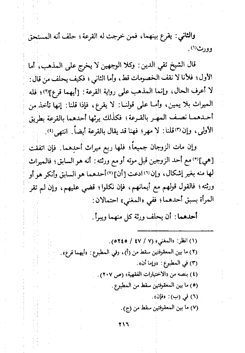 قال الشيخ تقي الدين: وكذا الوجهين لا يخرج على المذهب، أما الأول؛ فلأنا لا نقف الخصومات قط، وأما الثاني؛ فكيف يحلف من قال: لا أعرف الحال، وإنما المذهب على رواية القرعة: [أيهما قرع] (¬2)؛ فله الميراث بلا يمين، وأما على قولنا: لا يقرع، فإذا قلنا: إنها تأخذ من أحدهما نصف المهر بالقرعة؛ فكذلك يرثها أحدهما بالقرعة بطريق الأولى، وإن (¬3) قلنا: لا مهر؛ فهنا قد يقال بالقرعة أيضًا. انتهى (¬4).