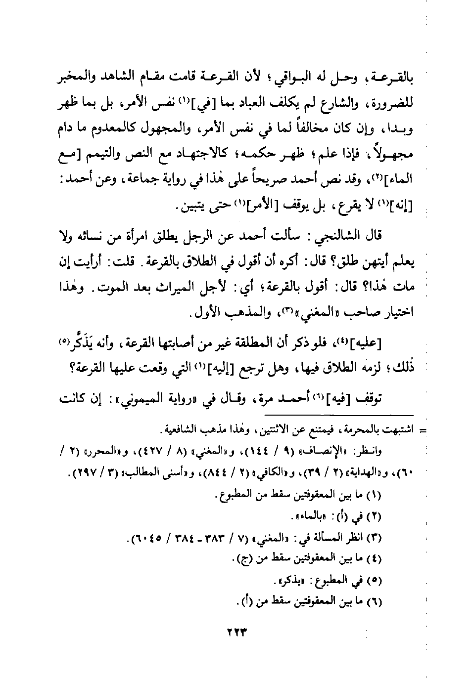 قال الشالنجي: سألت أحمد عن الرجل يطلق امرأة من نسائه ولا يعلم أيتهن طلق؟ قال: أكره أن أقول في الطلاق بالقرعة. قلت: أرأيت إن مات هذا؟ قال: أقول بالقرعة؛ أي: لأجل الميراث بعد الموت. وهذا اختيار صاحب "المغني" (¬3)، والمذهب الأول.