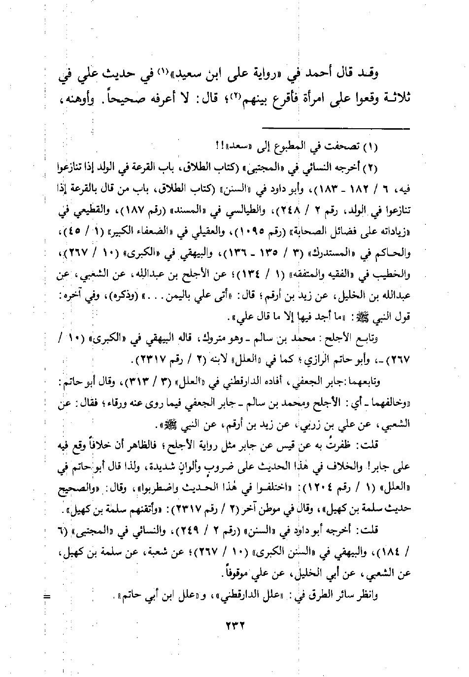 (¬2) أخرجه النسائي في "المجتبى" (كتاب الطلاق، باب القرعة في الولد إذا تنازعوا فيه، 6/ 182 - 183)، وأبو داود في "السنن" (كتاب الطلاق، باب من قال بالقرعة إذا تنازعوا في الولد، رقم 2/ 248)، والطيالسي في "المسند" (رقم 187)، والقطيعي في "زياداته على فضائل الصحابة" (رقم 1095)، والعقيلي في "الضعفاء الكبير" (1/ 45)، والحاكم في "المستدرك" (3/ 135 - 136)، والبيهقي في "الكبرى" (10/ 267)، والخطيب في "الفقيه والمتفقه" (1/ 134)؛ عن الأجلح بن عبد اللَّه، عن الشعبي، عن عبد اللَّه بن الخليل، عن زيد بن أرقم؛ قال: "أتى علي باليمن. . . " (وذكره)، وفي آخره: قول النبي -صلى اللَّه عليه وسلم-: "ما أجد فيها إلا ما قال علي".