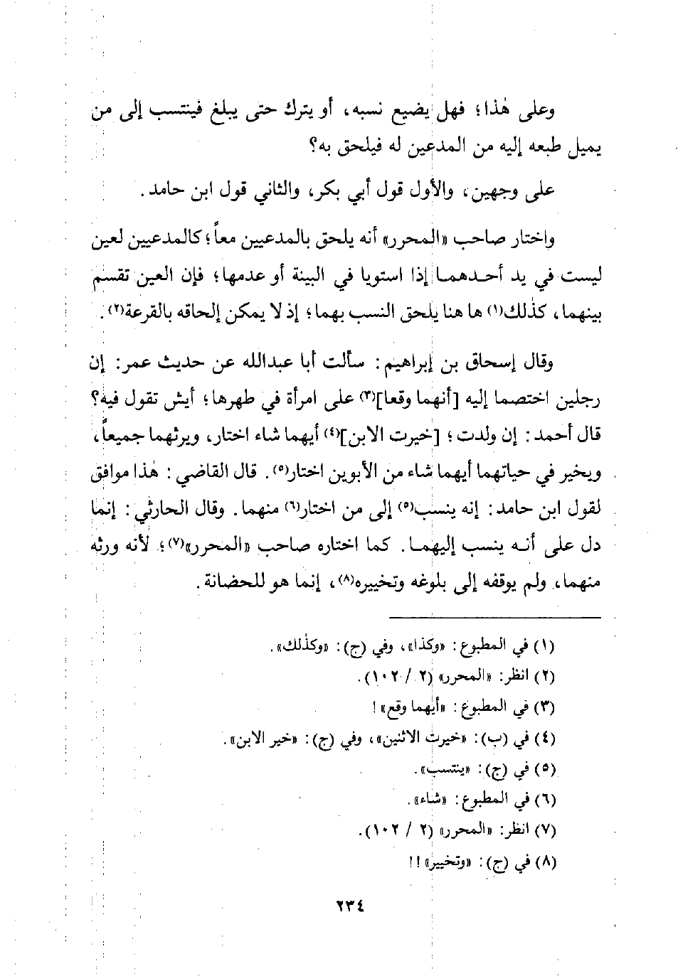 وقال إسحاق بن إبراهيم: سألت أبا عبد اللَّه عن حديث عمر: إن رجلين اختصما إليه [أنهما وقعا] (¬3) على امرأة في طهرها؛ أيش تقول فيه؟ قال أحمد: إن ولدت؛ [خيرت الابن] (¬4) أيهما شاء اختار، ويرثهما جميعًا، ويخير في حياتهما أيهما شاء من الأبوين اختار (¬5). قال القاضي: هذا موافق لقول ابن حامد: إنه ينسب (5) إلى من اختار (¬6) منهما. وقال الحارثي: إنما دل على أنه ينسب إليهما. كما أختاره صاحب "المحرر" (¬7)؛ لأنه ورثه منهما، ولم يوقفه إلى بلوغه وتخييره (¬8)، إنما هو للحضانة.