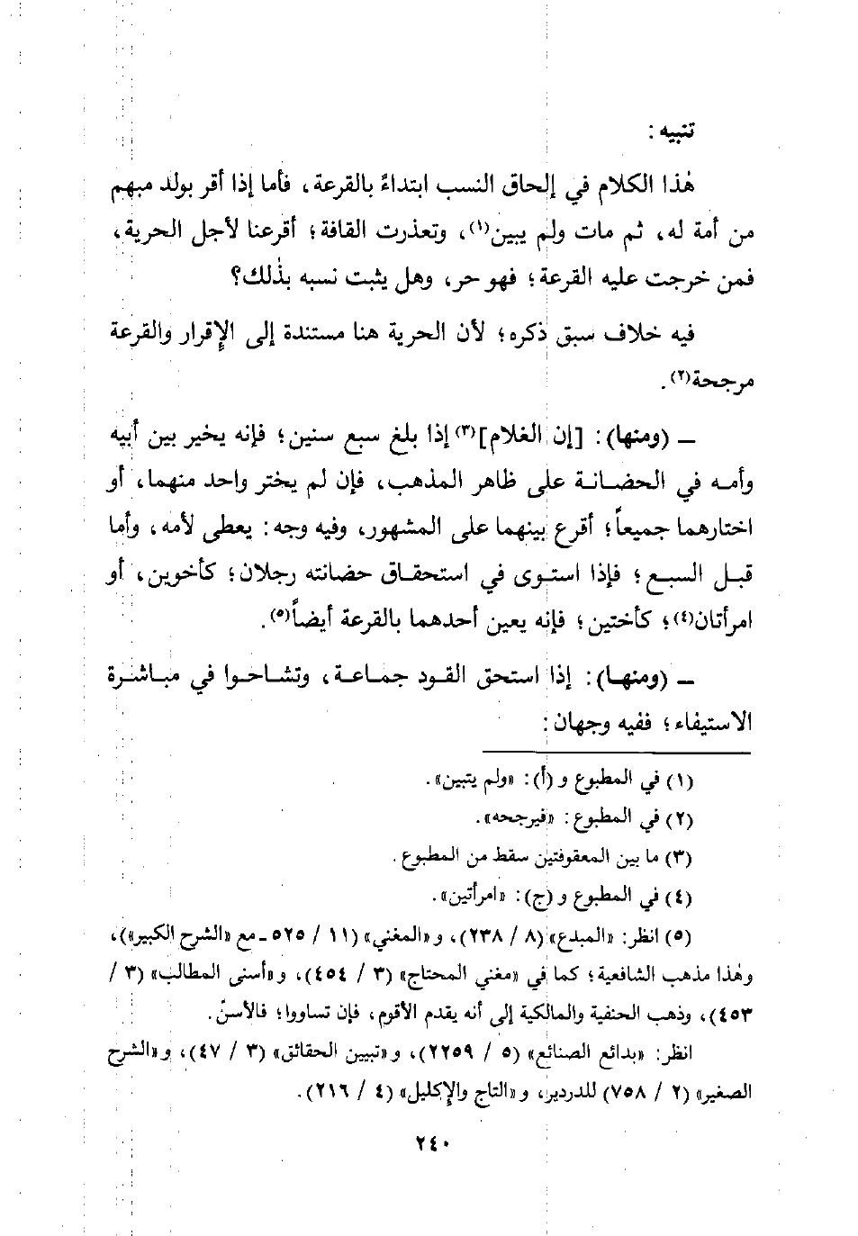 - (ومنها): [إن الغلام] (¬3) إذا بلغ سبع سنين؛ فإنه يخير بين أبيه وأمه في الحضانة على ظاهر المذهب، فإن لم يختر واحد منهما، أو اختارهما جميعًا؛ أقرع بينهما على المشهور، وفيه وجه: يعطى لأمه، وأما قبل السبع؛ فإذا استوى في استحقاق حضانته رجلان؛ كأخوين، أو امرأتان (¬4)؛ كأختين؛ فإنه يعين أحدهما بالقرعة أيضًا (¬5).