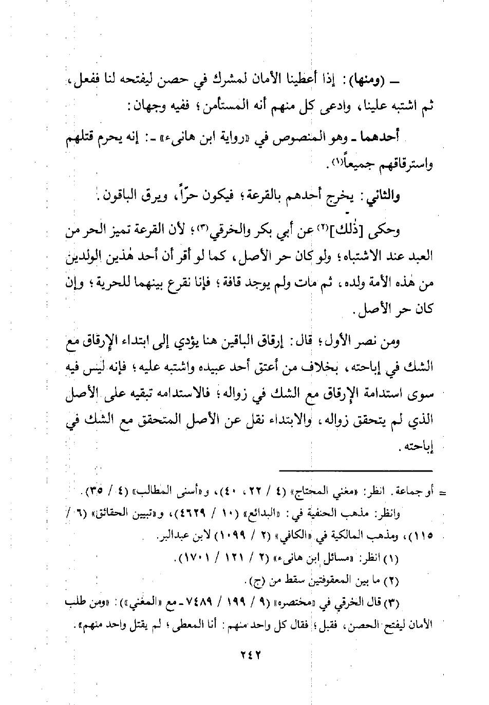ومن نصر الأول؛ قال: إرقاق الباقين هنا يؤدي إلى ابتداء الإرقاق مع الشك في إباحته، بخلاف من أعتق أحد عبيده واشتبه عليه؛ فإنه ليس فيه سوى استدامة الإرقاق مع الشك في زواله؛ فالاستدامه تبقيه على الأصل الذي لم يتحقق زواله، والابتداء نقل عن الأصل المتحقق مع الشك في إباحته.