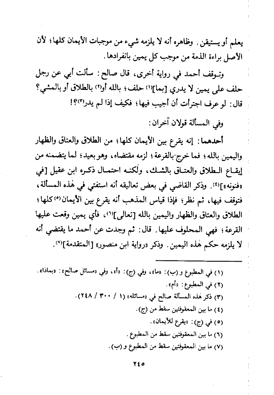 أحدهما: إنه يقرع بين الأيمان كلها؛ من الطلاق والعتاق والظهار واليمين باللَّه؛ فما خرج بالقرعة؛ لزمه مقتضاه، وهو بعيد؛ لما يتضمنه من إيقاع الطلاق والعتاق بالشك، ولكنه احتمال ذكره ابن عقيل [في "فنونه"] (¬4). وذكر القاضي في بعض تعاليقه أنه استفتي في هذه المسألة، فتوقف فيها، ثم نظر؛ فإذا قياس المذهب أنه يقرع بين الأيمان (¬5) كلها؛ الطلاق والعتاق والظهار واليمين باللَّه [تعالى] (¬6)، فأي يمين وقعت عليها القرعة؛ فهي المحلوف عليها. قال: ثم وجدت عن أحمد ما يقتضي أنه لا يلزمه حكم هذه اليمين. وذكر "رواية ابن منصور" [المتقدمة] (¬7).