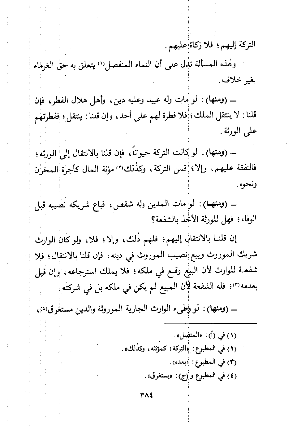 - (ومنها): لو مات وله عبيد وعليه دين، وأهل هلال الفطر، فإن قلنا: لا ينتقل الملك؛ فلا فطرة لهم على أحد، وإن قلنا: ينتقل؛ ففطرتهم على الورثة.