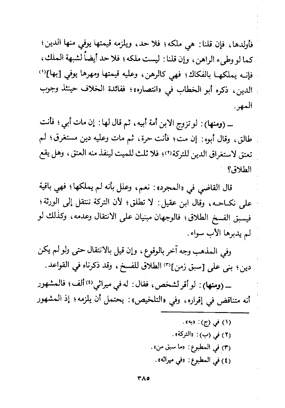 - (ومنها): لو تزوج الابن أمة أبيه، ثم قال لها: إن مات أبي؛ فأنت طالق، وقال أبى: إن مت؛ فأنت حرة، ثم مات وعليه دين مستغرق؛ لم تعتق لاستغراق الدين للتركة (¬2)؛ فلا ثلث للميت لينفذ منه العتق، وهل يقع الطلاق؟