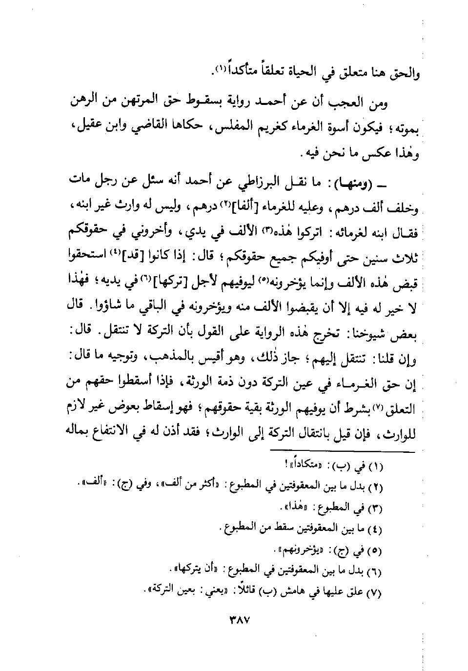 (¬7) علق عليها في هامش (ب) قائلًا: "يعني: بعين التركة".
