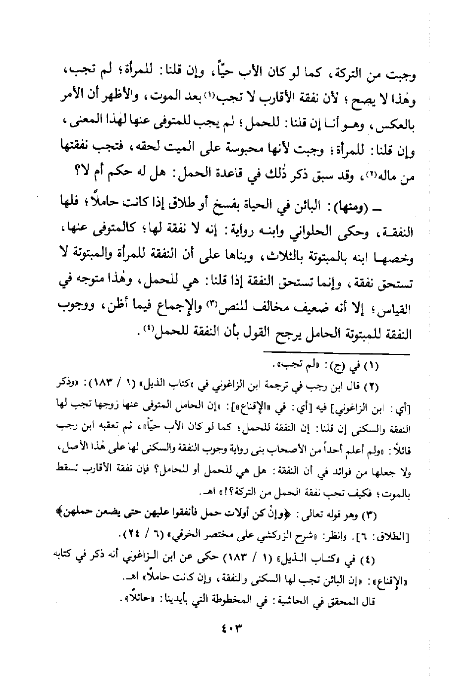 (¬2) قال ابن رجب في ترجمة ابن الزاغوني في "كتاب الذيل" (1/ 183): "وذكر [أي: ابن الزاغوني] فيه [أي: في "الإقناع"]،: "إن الحامل المتوفى عنها زوجها تجب لها النفقة والسكنى إن قد: إن النفقة للحمل؛ كما لو كان الأب حيًّا"، ثم تعقبه ابن رجب قائلًا: "ولم أعلم أحدًا من الأصحاب بنى رواية وجوب النفقة والسكنى لها على هذا الأصل، ولا جعلها من فوائد في أن النفقة: هل هي للحمل أو للحامل؟ فإن نفقة الأقارب تسقط بالموت؛ فكيف تجب نفقة الححل من التركة؟! " اهـ.