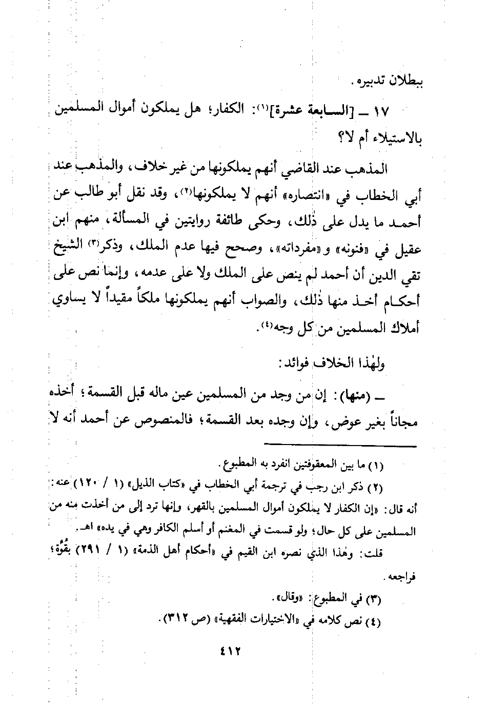 (¬2) ذكر ابن رجب في ترجمة أبي الخطاب في "كتاب الذيل" (1/ 120) عنه: أنه قال: "إن الكفار لا يملكون أموال المسلمين بالقهر، وإنها ترد إلى من أخذت منه من المسلمين على كل حال؛ ولو قسمت في المغنم أو أسلم الكافر وهي في يده" اهـ.