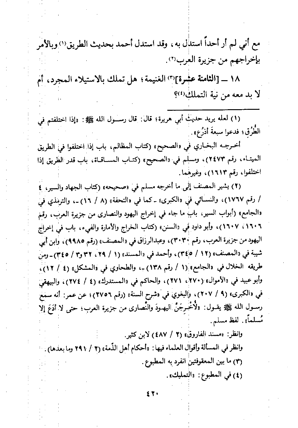 (¬2) يشير المصف إلى ما أخرجه مسلم في "صحيحه" (كتاب الجهاد والسير، 4/ رقم 1767)، والنسائي في "الكبرى" -كما في "التحفة" (8/ 16) -، والترمذي في "الجامع" (أبواب السير، باب ما جاء في إخراج اليهود والنصارى من جزيرة العرب، رقم 1606، 1607)، وأبو داود في "السنن" (كتاب الخراج والإمارة والفيء، باب في إخراج اليهود من جزيرة العرب، رقم 3030)، وعبد الرزاق في "المصنف" (رقم 9985)، وابن أبي شيبة في "المصنف" (12/ 345)، وأحمد في "المسند" (1/ 29، 32 و 3/ 345) -ومن طريقه الخلال في "الجامع" (1/ رقم 138) -، والطحاوي في "المشكل" (4/ 12)، وأبو عبيد في "الأموال" (270، 271)، والحاكم في "المستدرك" (4/ 274)، والبيهقي في "الكبرى" (9/ 207)، والبغوي في "شرح السنة" (رقم 2756)؛ عن عمر: أنه سمع رسول اللَّه -صلى اللَّه عليه وسلم- يقول: "لأُخْرِجَنَّ اليهودَ والنَّصارى من جزيرة العرب؛ حتى لا أدَعَ إلا مُلسمًا". لفظ مسلم.