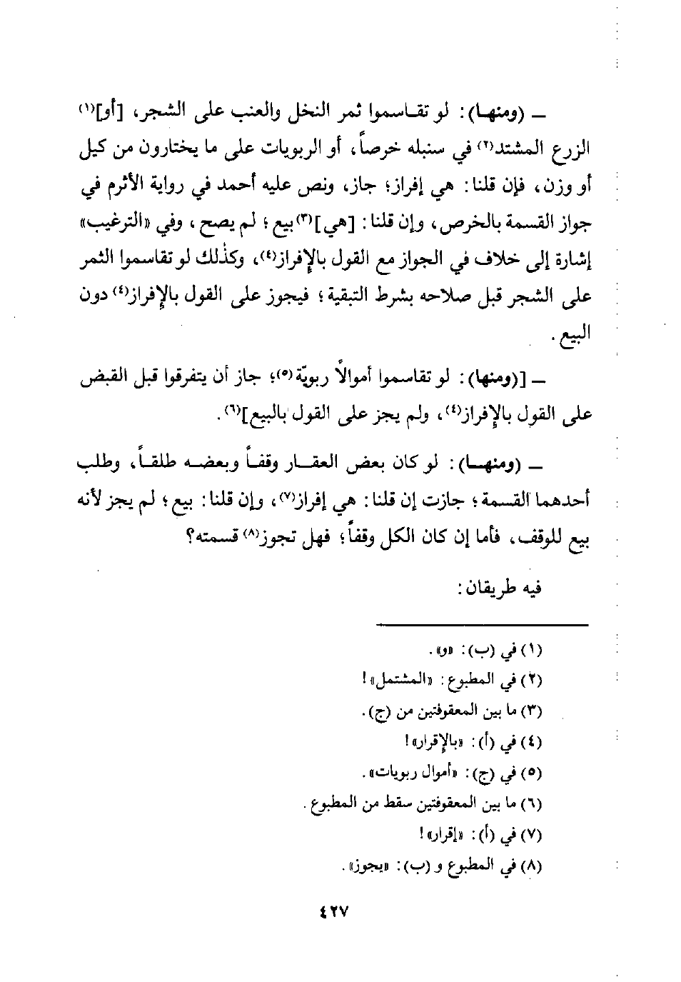 - (ومنها): لو كان بعض العقار وقفًا وبعضه طلقًا، وطلب أحدهما القسمة؛ جازت إن قلنا: هي إفراز (¬7)، وإن قلنا: بيع؛ لم يجز لأنه بيع للوقف، فأما إن كان الكل وقفًا؛ فهل تجوز (¬8) قسمته؟