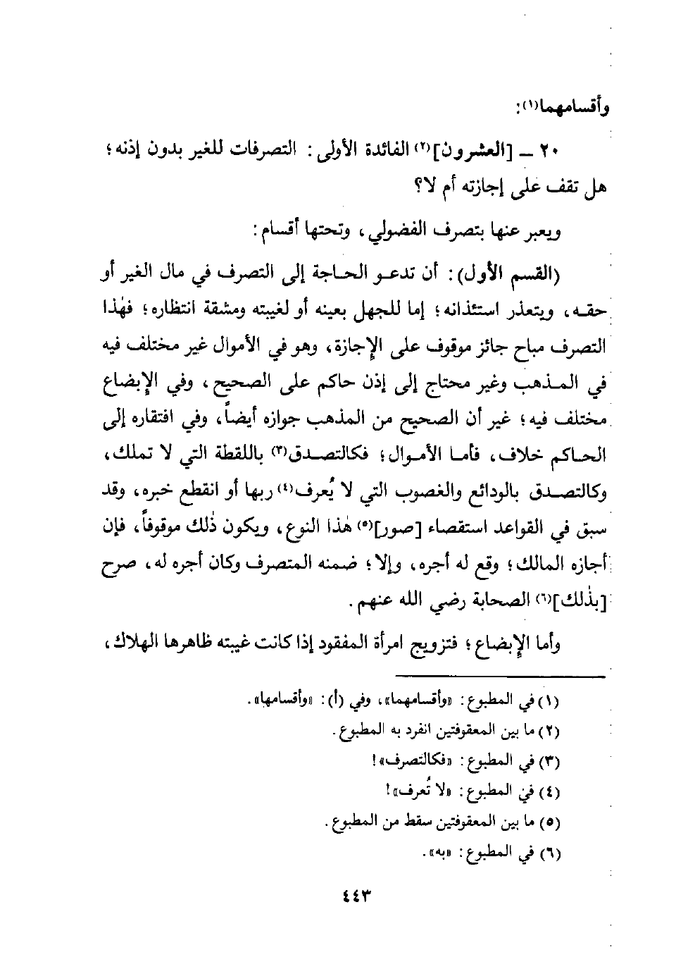 20 - [العشرون] (¬2) الفائدة الأولى: التصرفات للغير بدون إذنه؛ هل تقف على إجازته أم لا؟