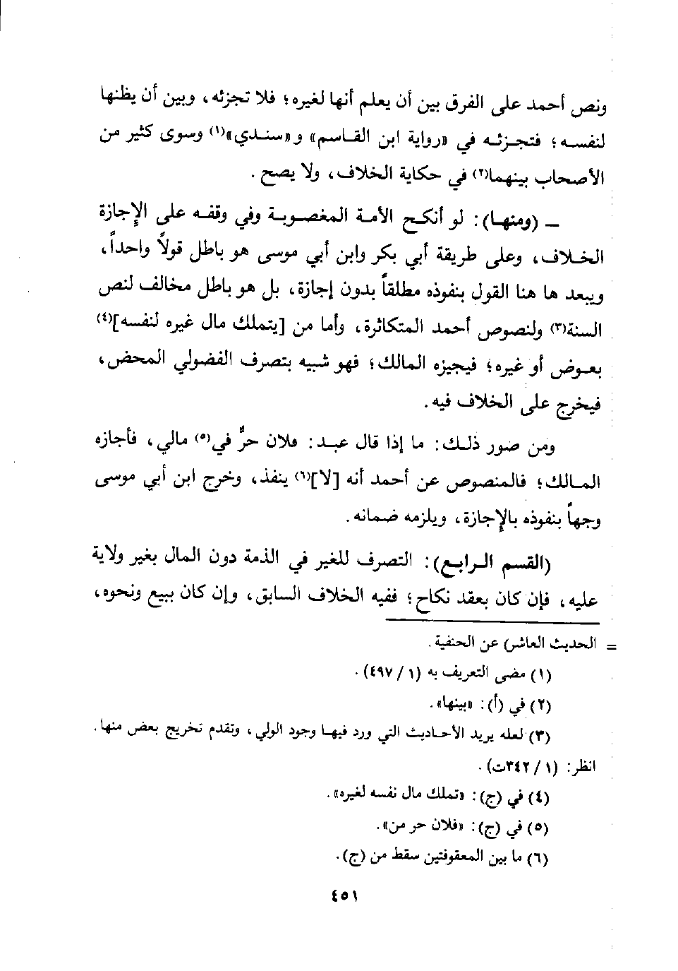 - (ومنها): لو أنكح الأمة المغصوبة وفي وقفه على الإجازة الخلاف، وعلى طريقة أبي بكر وابن أبي موسى هو باطل قولًا واحدًا، ويبعد ها هنا القول بنفوذه مطلقًا بدون اجازة، بل هو باطل مخالف لنص السنة (¬3) ولنصوص أحمد المتكاثرة، وأما من [يتملك مال غيره لنفسه] (¬4) بعوض أو غيره؛ فيجيزه المالك؛ فهو شبيه بتصرف الفضولي المحض، فيخرج على الخلاف فيه.