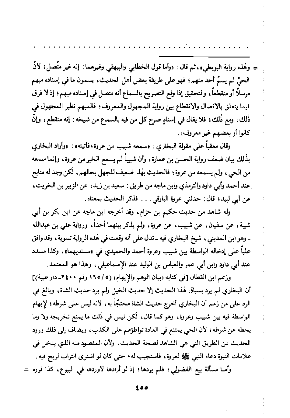 = وهذه رواية البويطي، ثم قال: "وأما قول الخطابي والبيهقي وغيرهما: إنه غير متّصل؛ لأنّ الحيَّ لم يسمّ أحد منهم؛ فهو على طريقة بعض أهل الحديث، يسمون ما في إسناده مبهم مرسلًا أو منقطعًا، والتحقيق إذا وقع التصريح بالسماع أنه متصل في إسناده مبهم؛ إذ لا فرق فيما يتعلق بالاتصال والانقطاع بين رواية المجهول والمعروف؛ فالمبهم نظير المجهول في ذلك، ومع ذلك، فلا يقال في إسنادٍ صرح كل من فيه بالسماع من شيخه: إنه منقطع، وإنْ كانوا أو بعضهم غير معروف".