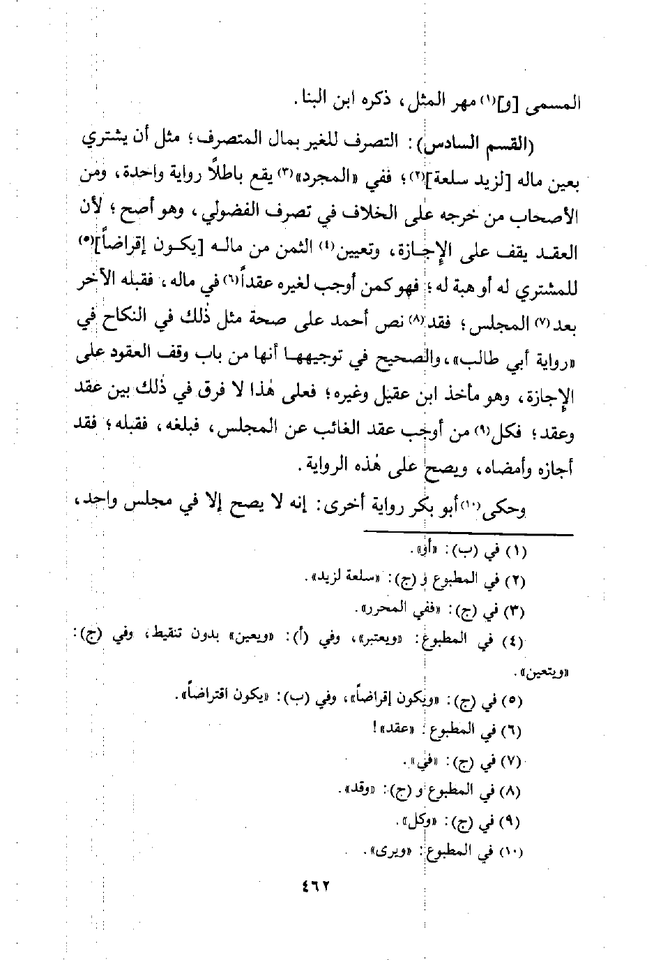 (القسم السادس): التصرف للغير بمال المتصرف؛ مثل أن يشتري بعين ماله [لزيد سلعة] (¬2)؛ ففي "المجرد" (¬3) يقع باطلًا رواية واحدة، ومن الأصحاب من خرجه على الخلاف في تصرف الفضولي، وهو أصح؛ لأن العقد يقف على الإِجازة، وتعيين (¬4) الثمن من ماله [يكون إقراضًا] (¬5) للمشتري له أو هبة له؛ فهو كمن أوجب لغيره عقدًا (¬6) في ماله، فقبله الآخر بعد (¬7) المجلس، فقد (¬8) نص أحمد على صحة مثل ذلك في النكاح في "رواية أبي طالب"، والصحيح في توجيهها أنها من باب وقف العقود على الإجازة، وهو مأخذ ابن عقيل وغيره؛ فعلى هذا لا فرق في ذلك بين عقد وعقد؛ فكل (¬9) من أوجب عقد الغائب عن المجلس، فبلغه، فقبله، فقد أجازه وأمضاه، ويصح على هذه الرواية.