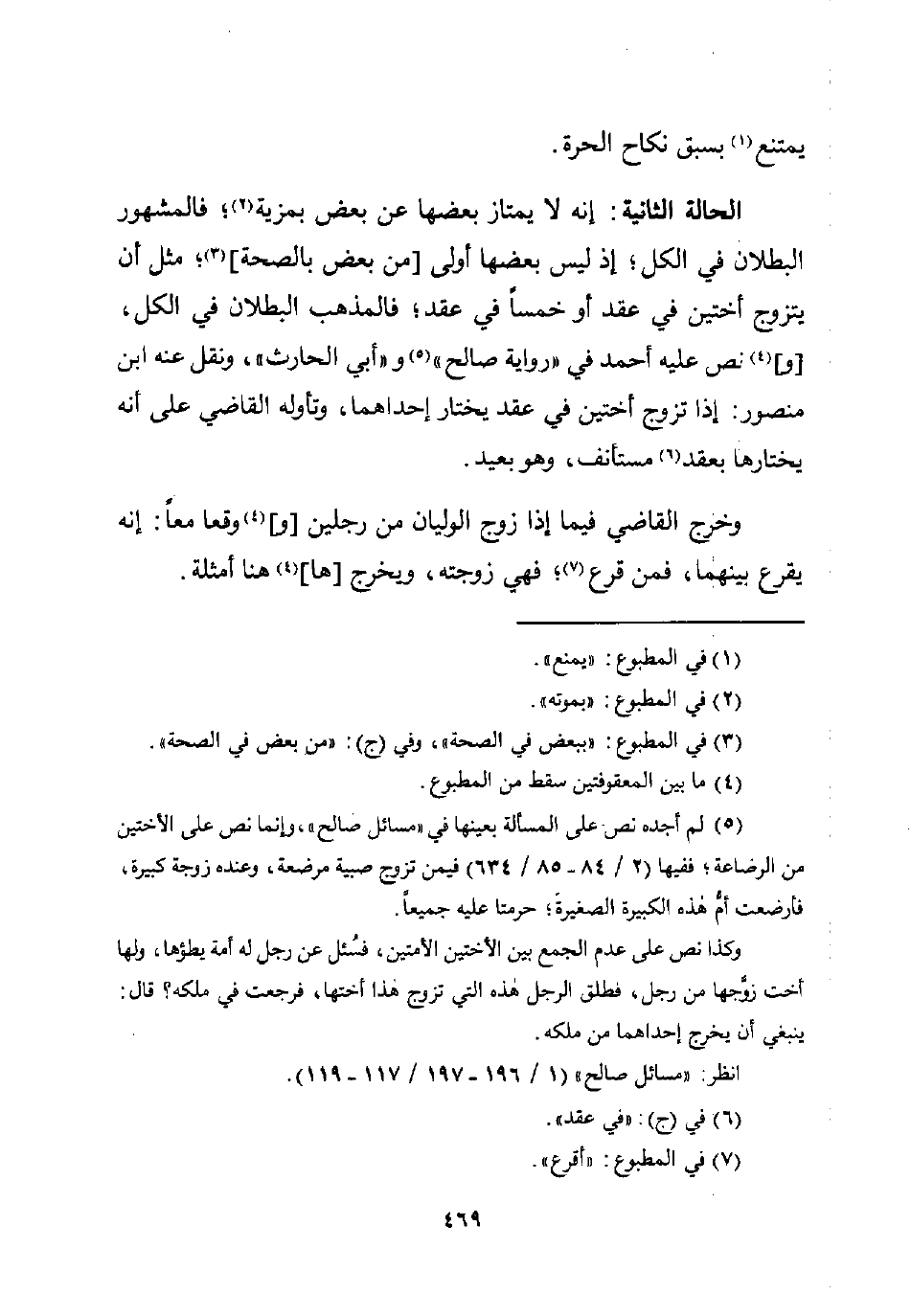 (¬5) لم أجده نص على المسألة بعينها في "مسائل صالح"، وإنما نص على الأختين من الرضاعة؛ ففيها (2/ 84 - 85/ 634) فيمن تزوج صبية مرضعة، وعنده زوجة كبيرة، فأرضعت أمُّ هذه الكبيرة الصغيرة؛ حرمتا عليه جميعًا.