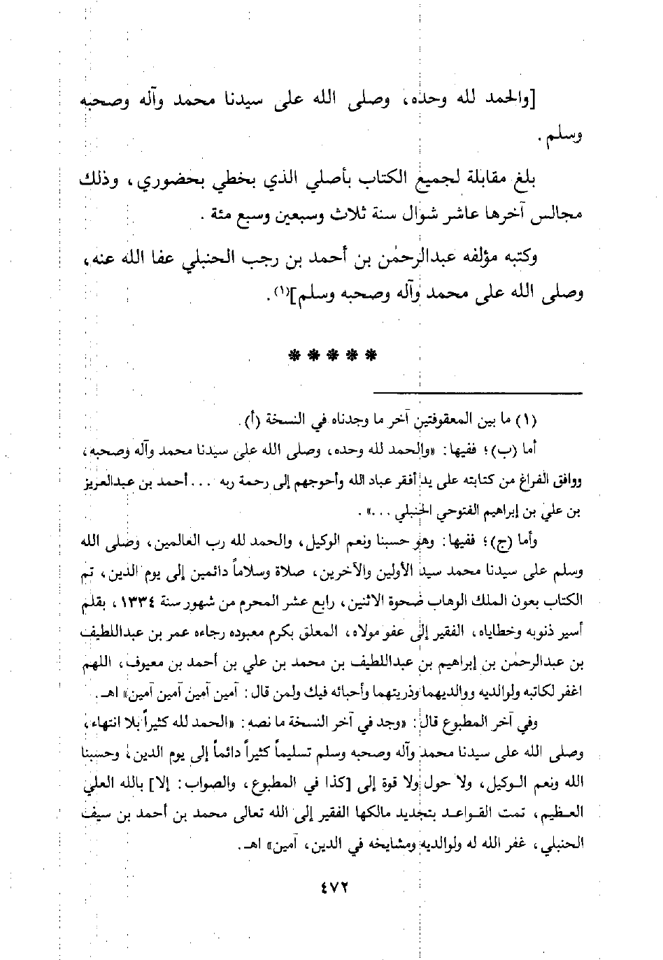 وأما (ج)؛ ففيها: وهو حسبنا ونعم الوكيل، والحمد للَّه رب العالمين، وصلى اللَّه وسلم على سيدنا محمد سيد الأولين والآخرين، صلاة وسلامًا دائمين إلى يوم الدين، تم الكتاب بعون الملك الوهاب ضحوة الاثنين، رابع عشر المحرم من شهور سنة 1334، بقلم أسير ذنوبه وخطاياه، الفقير إلى عفو مولاه، المعلق بكرم معبوده رجاءه عمر بن عبد اللطيف بن عبد الرحمن بن إبراهيم بن عبد اللطيف بن محمد بن علي بن أحمد بن معيوف، اللهم اغفر لكاتبه ولوالديه ووالديهما وذريتهما وأحبائه فيك ولمن قال: آمين آمين آمين آمين" اهـ.