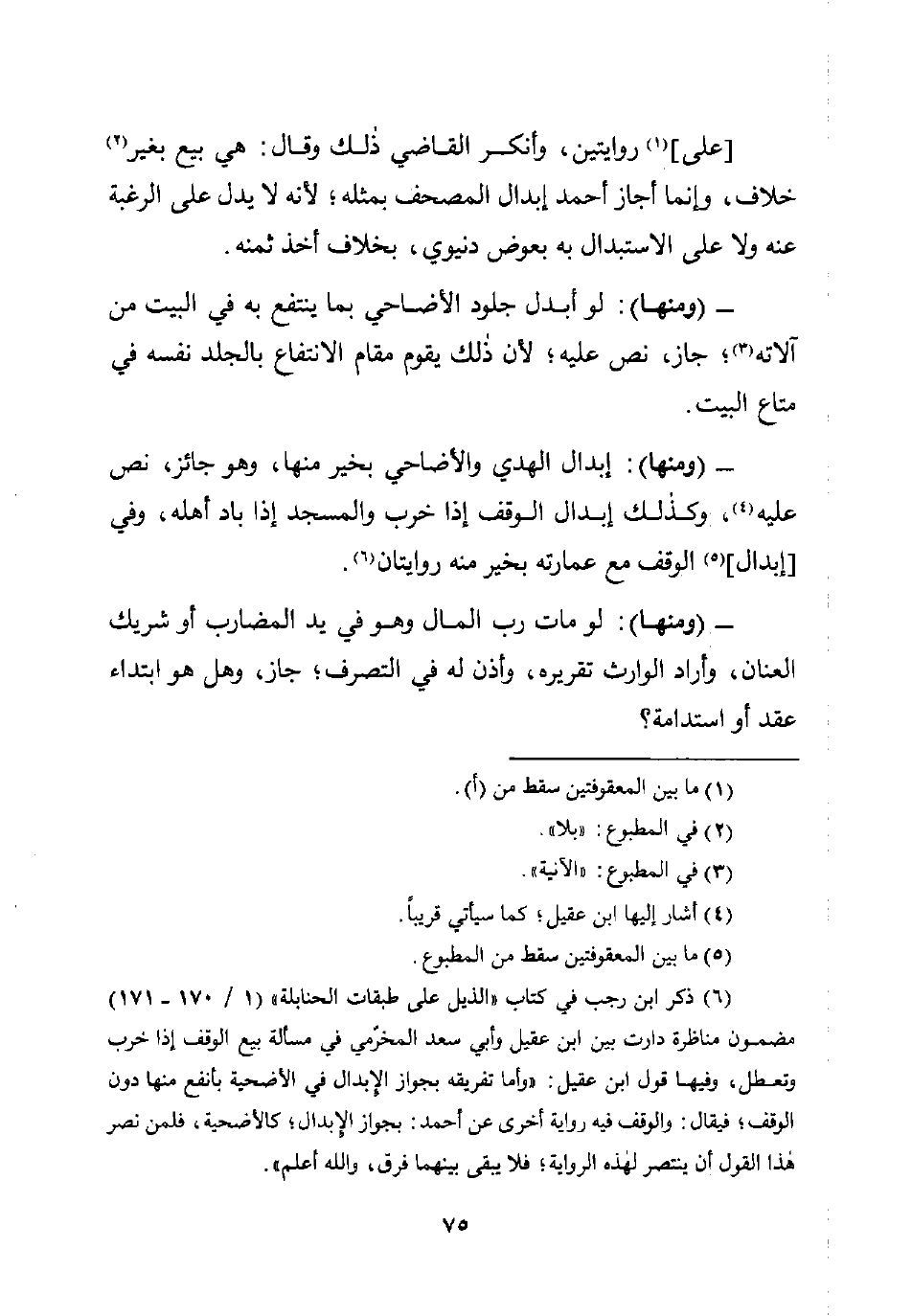 (¬6) ذكر ابن رجب في كتاب "الذيل على طبقات الحنابلة" (1/ 170 - 171) مضمون مناظرة دارت بين ابن عقيل وأبي سعد المخرّمي في مسألة بيع الوقف إذا خرب وتعطل، وفيها قول ابن عقيل: "وأما تفريقه بجواز الإبدال في الأضحية بأنفع منها دون الوقف؛ فيقال: والوقف فيه رواية أخرى عن أحمد: بجواز الإبدال؛ كالأضحية، فلمن نصر هذا القول أن ينتصر لهذه الرواية؛ فلا يبقى بينهما فرق، واللَّه أعلم".