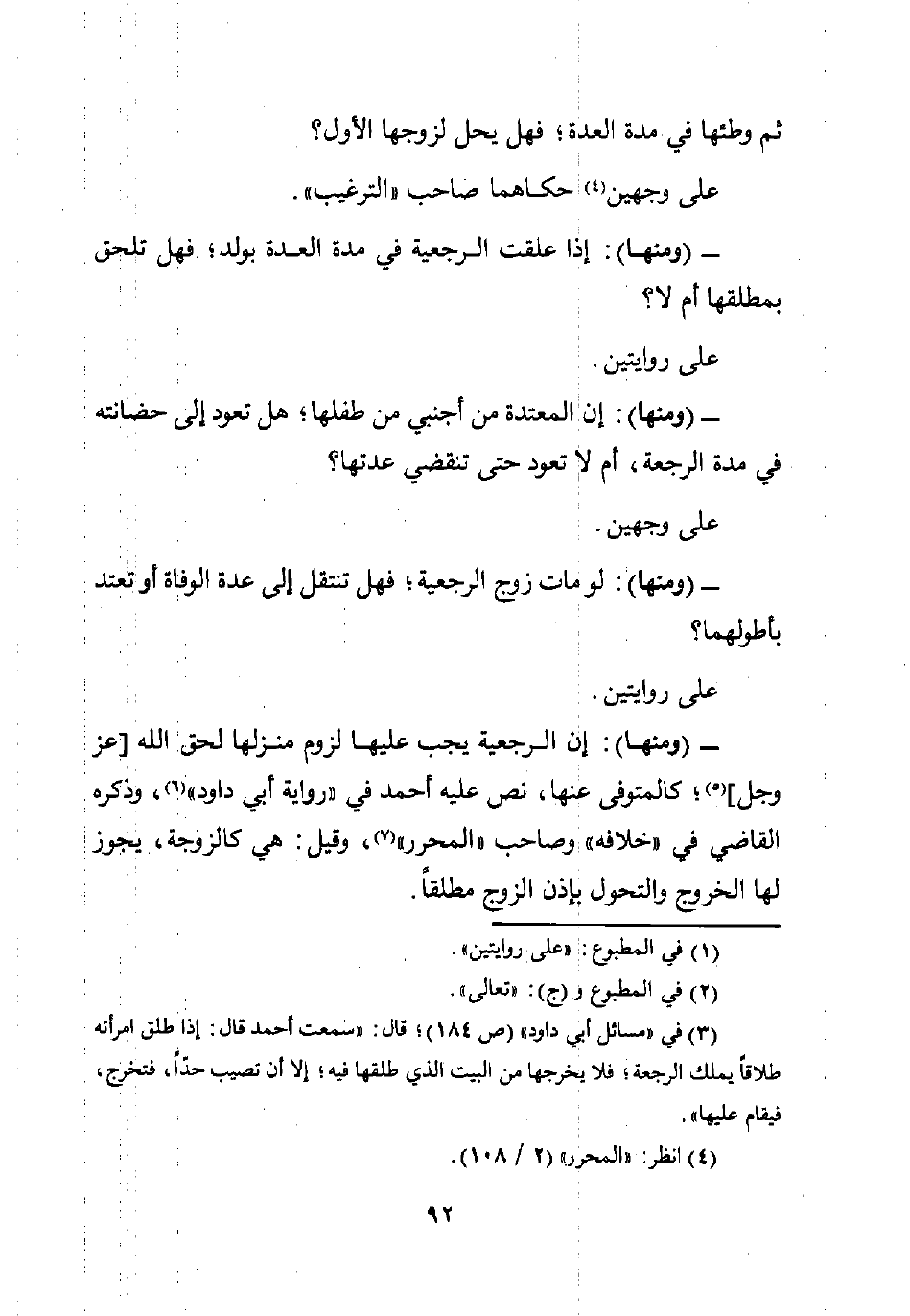 - (ومنها): إن الرجعية يجب عليها لزوم منزلها لحق اللَّه [عز وجل] (¬2)؛ كالمتوفى عنها، نص عليه أحمد في "رواية أبي داود" (¬3)، وذكره القاضي في "خلافه" وصاحب "المحرر" (¬4)، وقيل: هي كالزوجة، يجوز لها الخروج والتحول بإذن الزوج مطلقًا.