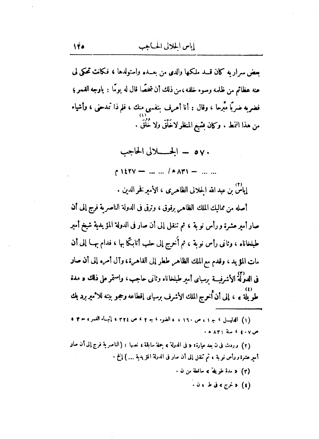 بعض سراريه كان قد ملكها والدي من بعده واستولدها، فكانت تحكى عنه عظائم من ظلمه وسوء خلقه، من ذلك أن شخصاً قال له يوماً: يا وجه القمر؛ فضربه ضرباً مبرحاً، وقال: أنا أعرف بنفسي منك، فلم ذا تمدحني، وأشياء من هذا النمط. وكان بشيع المنظر لا خلق ولا خلق.