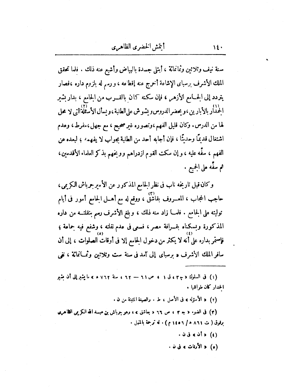 وكان قبل تاريخه ناب في نظر الجامع المذكور عن الأمير جرباش الكريمي، حاجب الحجاب، المعروف بقاشق، ووقع له مع أهل الجامع أمور في أيام توليته على الجامع. فلما زاد منه ذلك، وبلغ الأشرف رسم بنقلته من داره المذكورة وبسكناه بقرافة مصر، فسعى في عدم نقلته، وشفع فيه جماعة؛ فاستمر بداره على أنه لا يكثر من دخول الجامع إلا في أوقات الصلوات، إلى أن سافر الملك الأشرف برسباي إلى آمد في سنة ست وثلاثين وثمانمائة، نفى
