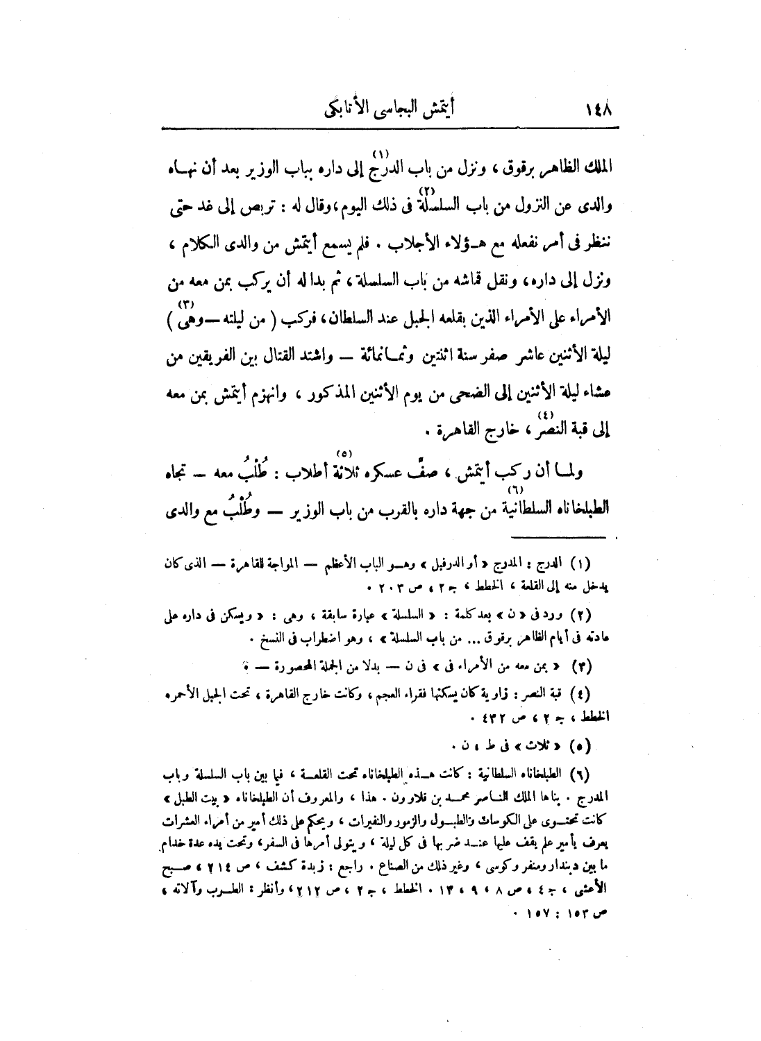 ولما أن ركب أيتمش، صف عسكره ثلاثة أطلاب: طلب معه - تجاه الطبلخاناه السلطانية من جهة داره بالقرب من باب الوزير - وطلب مع والدي