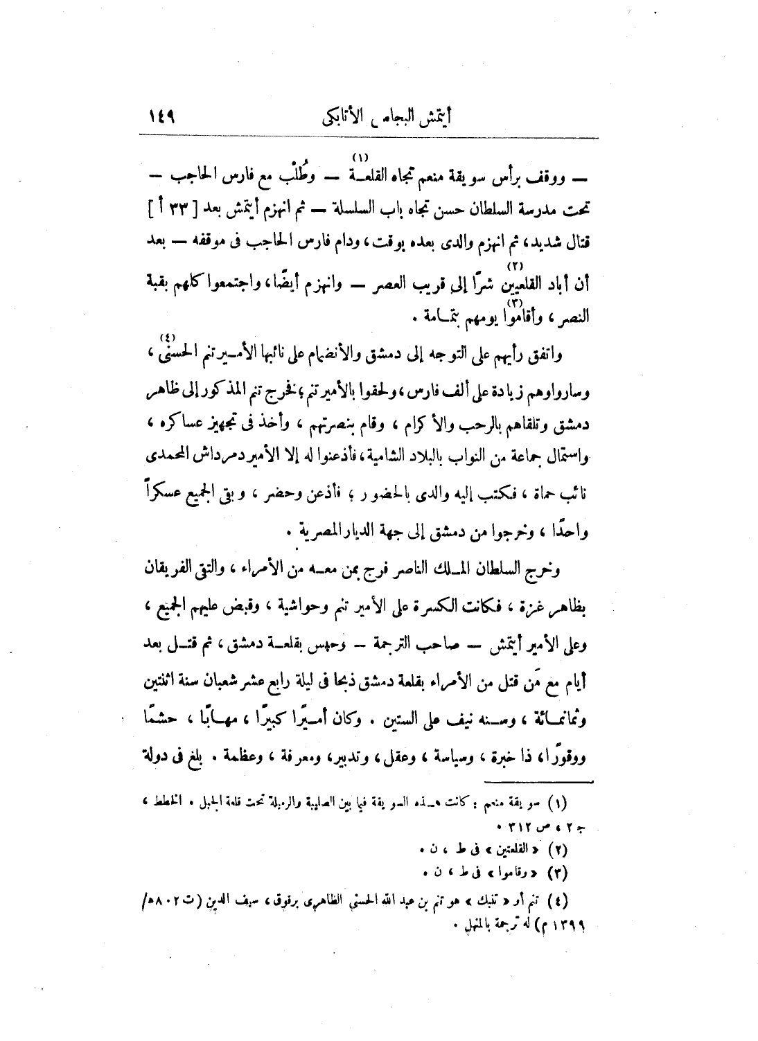 واتفق رأيهم على التوجه إلى دمشق والانضمام على نائبها الأمير تنم الحسني، وساروا وهم زيادة على ألف فارس، ولحقوا بالأمير تنم؛ فخرج تنم المذكور إلى ظاهر دمشق وتلقاهم بالرحب والإكرام، وقام بنصرتهم، وأخذ في تجهيز عساكره، واستمال جماعة من النواب بالبلاد الشامية، فأذعنوا له إلا الأمير دمرداش المحمدي نائب حماة، فكتب إليه والدي بالحضور؛ فأذعن وحضر، وبقي الجميع عسكراً واحداً، وخرجوا من دمشق إلى جهة الديار المصرية.