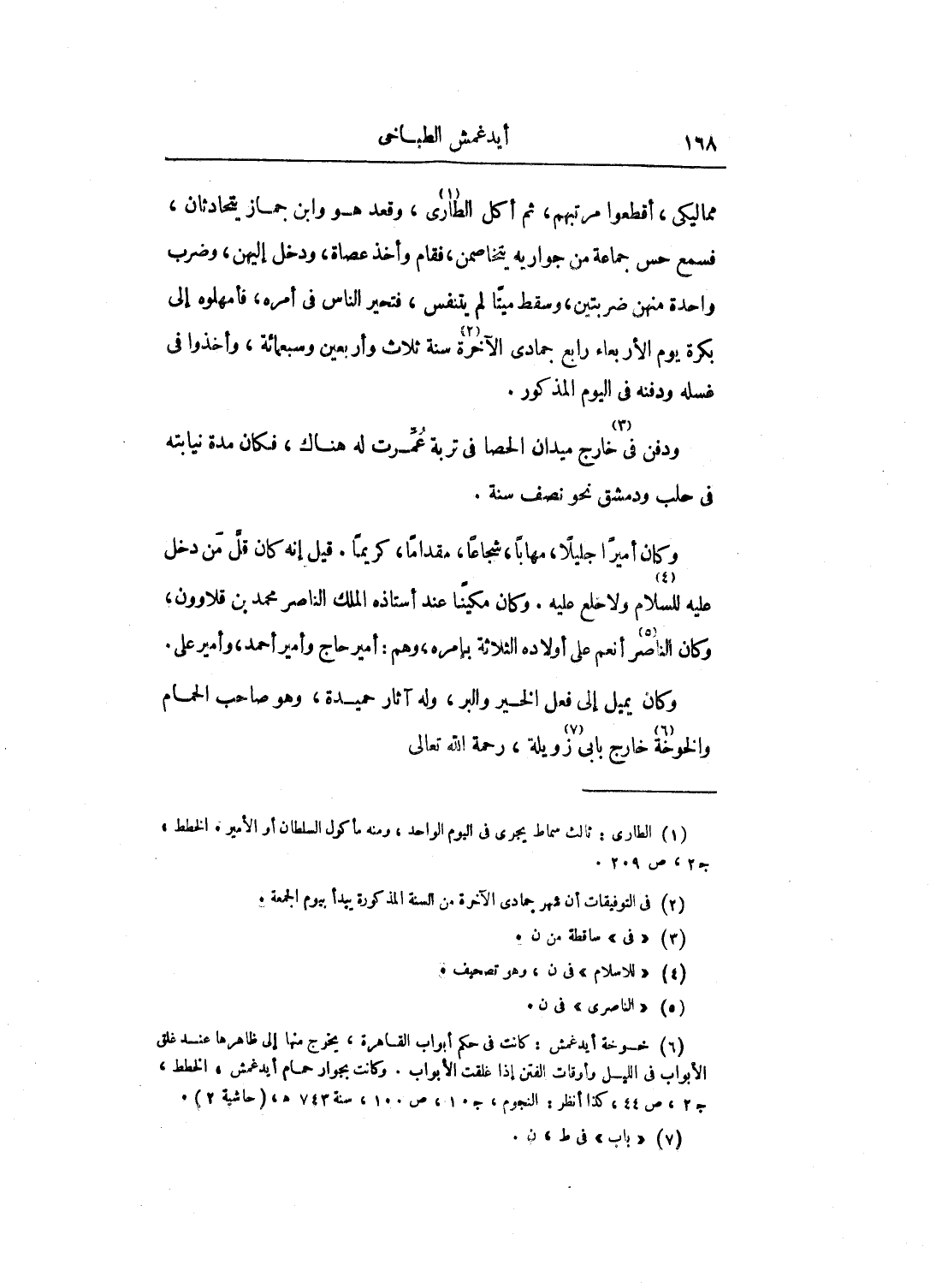 مماليكي، أقطعوا مرتبهم، ثم أكل الطاري، وقعد هو وابن جماز يتحادثان، فسمع حس جماعة من جواريه يتخاصمن، فقام وأخذ عصاة، ودخل إليهن، وضرب واحدة منهن ضربتين، وسقط ميتاً لم يتنفس، فتحير الناس في أمره، فأمهلوه إلى بكرة يوم الأربعاء رابع جمادى الآخرة سنة ثلاث وأربعين وسبعمائة، وأخذوا في غسله ودفنه في اليوم المذكور.