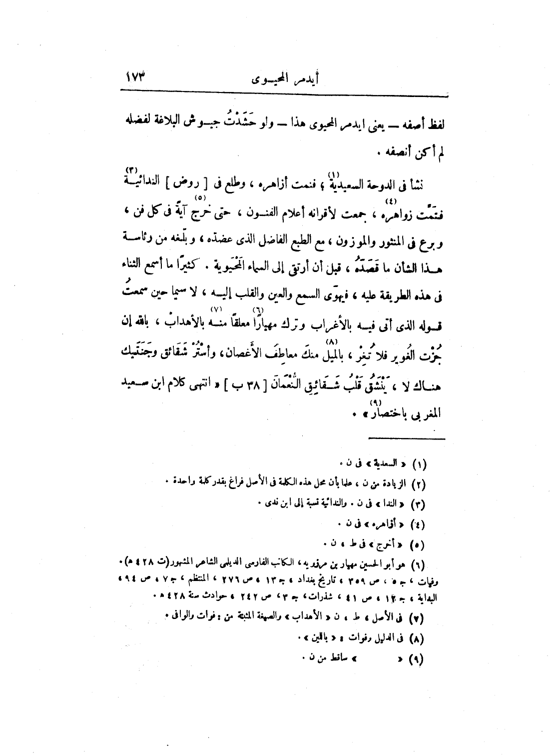 نشأ في الدولة السعيدية؛ فنمت أزاهره، وطلع في روض الندائية فتمت زواهره، جمعت لأقرانه أعلام الفنون، حتى خرج آيةً في كل فن، وبرع في المنثور والموزون، مع الطبع الفاضل الذي عضده، وبلغه من رئاسة هذا الشأن ما قصده، قبل أن أرتقي إلى السماء المحيوية. كثيراً ما أسمع الثناء في هذه الطريقة عليه، فيهوى السمع والعين والقلب إليه، لا سيما حين سمعت قوله الذي أتى فيه بالأغراب وترك مهياراً معلقاً منه بالأهداب، بالله إن جزت الغوير فلا تغر، بالميل منك معاطف الأغصان، واستر شقائق وجنتيك هناك لا، ينشق قلب شقائق النعمان انتهى كلام ابن سعيد المغربي باختصار.
