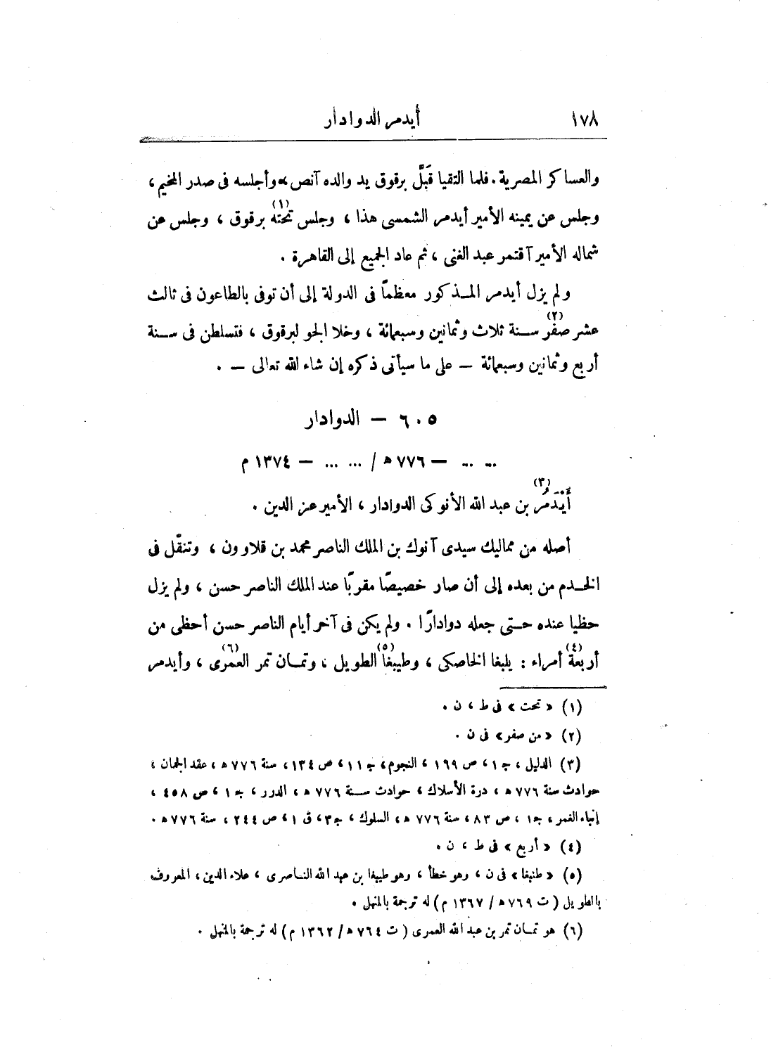 ولم يزل أيدمر المذكور معظماً في الدولة إلى أن توفى بالطاعون في ثالث عشر صفر سنة ثلاث وثمانين وسبعمائة، وخلا الجو لبرقوق، فتسلطن في سنة أربع وثمانين وسبعمائة - على ما سيأتي ذكره إن شاء الله تعالى -.