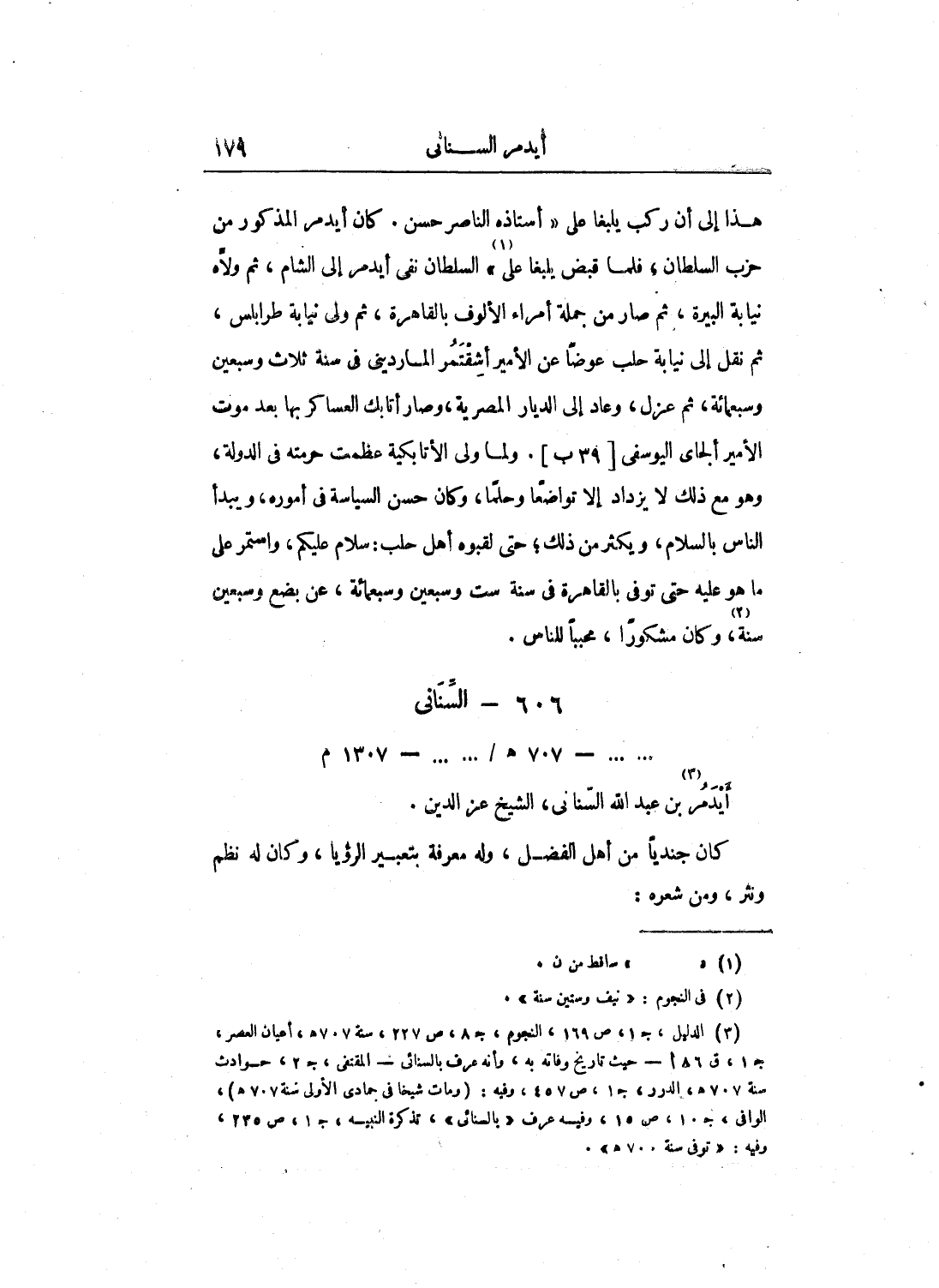 هذا إلى أن ركب يلبغا على أستاذه الناصر حسن. كان أيدمر المذكور من حزب السلطان، فلما قبض يلبغا على السلطان نفى أيدمر إلى الشام، ثم ولاه نيابة البيرة، ثم صار من جملة أمراء الألوف بالقاهرة، ثم ولى نيابة طرابلس، ثم نقل إلى نيابة حلب عوضاً عن الأمير أشقتمر المارديني في سنة ثلاث وسبعين وسبعمائة، ثم عزل، وعاد إلى الديار المصرية، وصار أتابك العساكر بها بعد موت الأمير ألجاي اليوسفي. ولما ولى الأتابكية عظمت حرمته في الدولة، وهو مع ذلك لا يزداد إلا تواضعاً وحلماً، وكان حسن السياسة في أموره، ويبدأ الناس بالسلام، ويكثر من ذلك؛ حتى لقبوه أهل حلب: سلام عليكم، واستمر على ما هو عليه حتى توفي بالقاهرة في سنة ست وسبعين وسبعمائة، عن بضع وسبعين سنة، وكان مشكوراً، محبباً للناس.